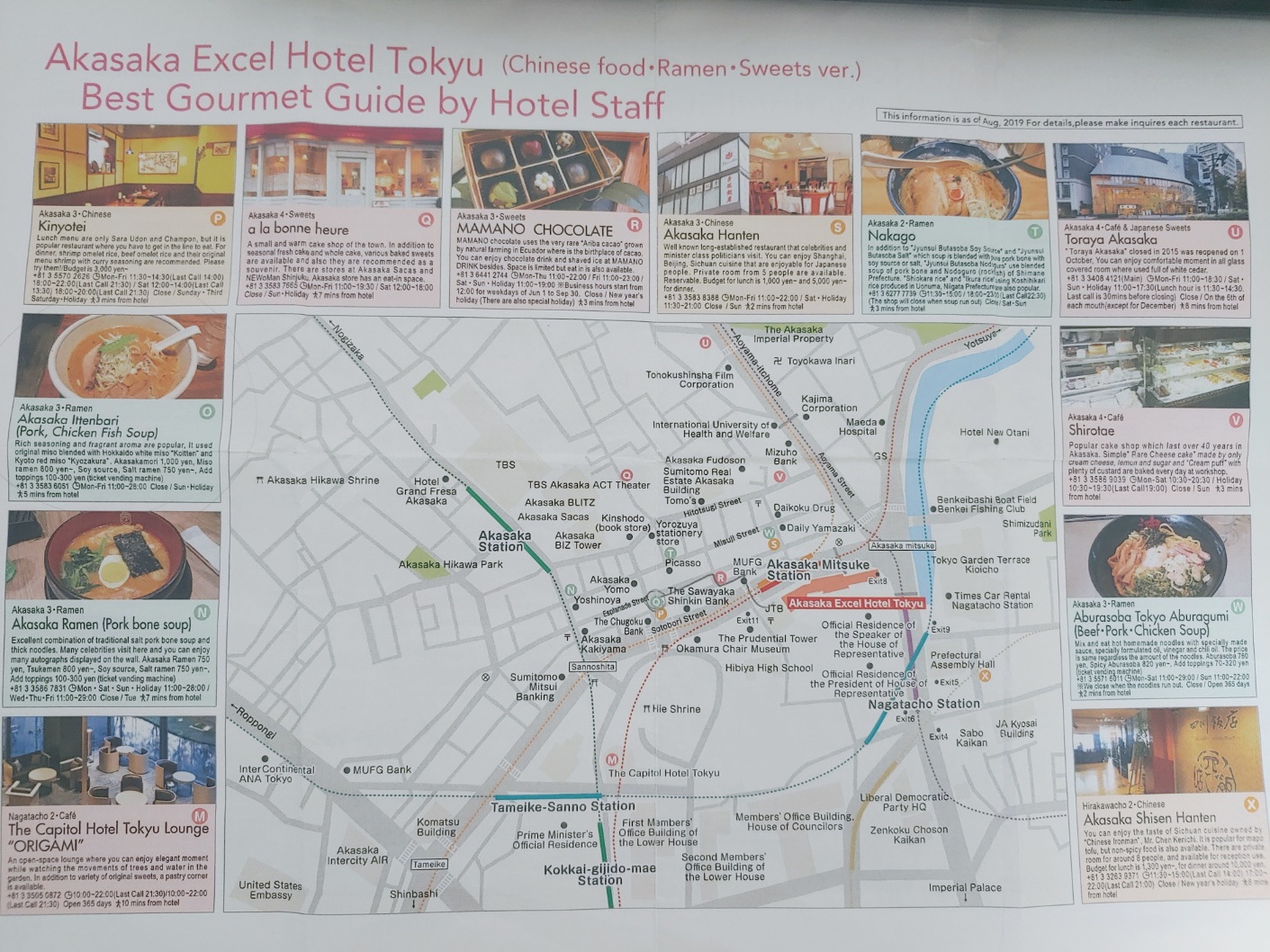 - 저녁 8시 넘어서 호텔 도착했기에 배고파서 로비에 문의 하니 아래 사진과 같이 근처 맛집 약도를 주었어요(단, 2019년 버전임). 근처에 번화가가 있어서 일본 문화도 즐기면서 식사를 할 수 있었어요.
