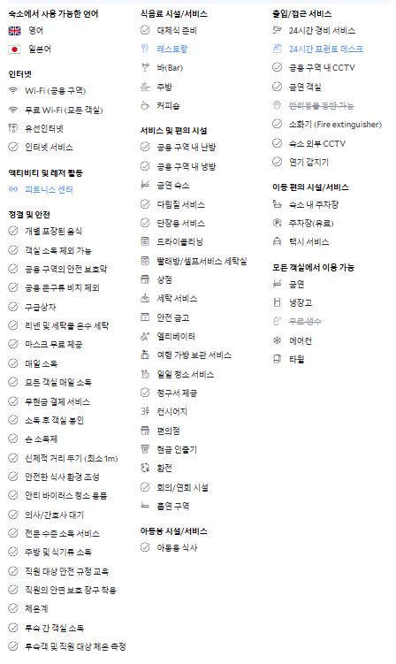 - 레스토랑 바, 피트니스 센터, 흡연코너, 미니마켓, 모닝콜 서비스, 컨시어지 서비스, 수하물 보관, 세탁서비스, 24시간 시스템보안 등등 아래의 사진 참고하세요.
