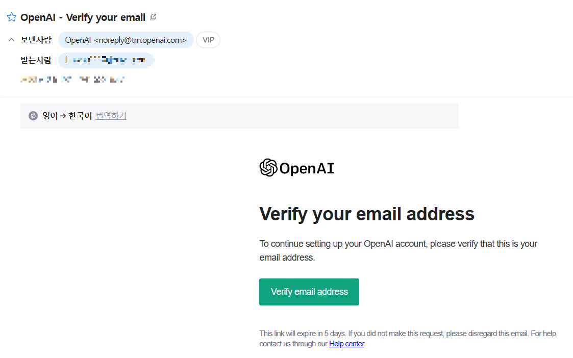 7. 입력하신 e-mail로 가시면 아래와 같이 Open AI에서 보낸 메일이 있어요. Verify email address 버튼을 클릭!