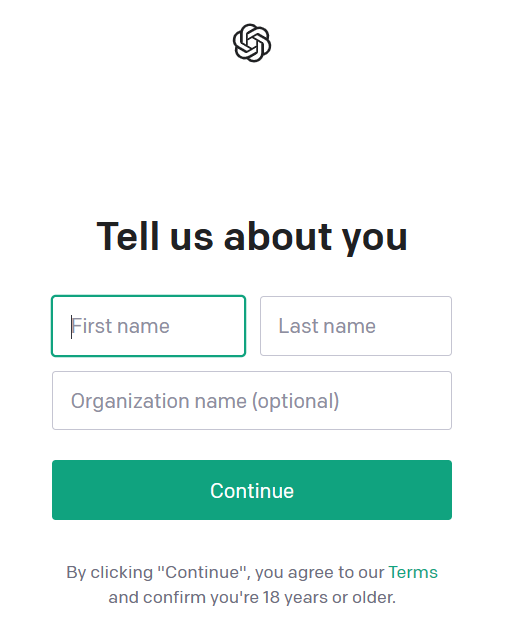 그러면 아래와 같이 챗 gpt에서 사용할 자신의 이름을 입력하라고 나와요. 이름과 성 순서로 입력하시면 돼요.