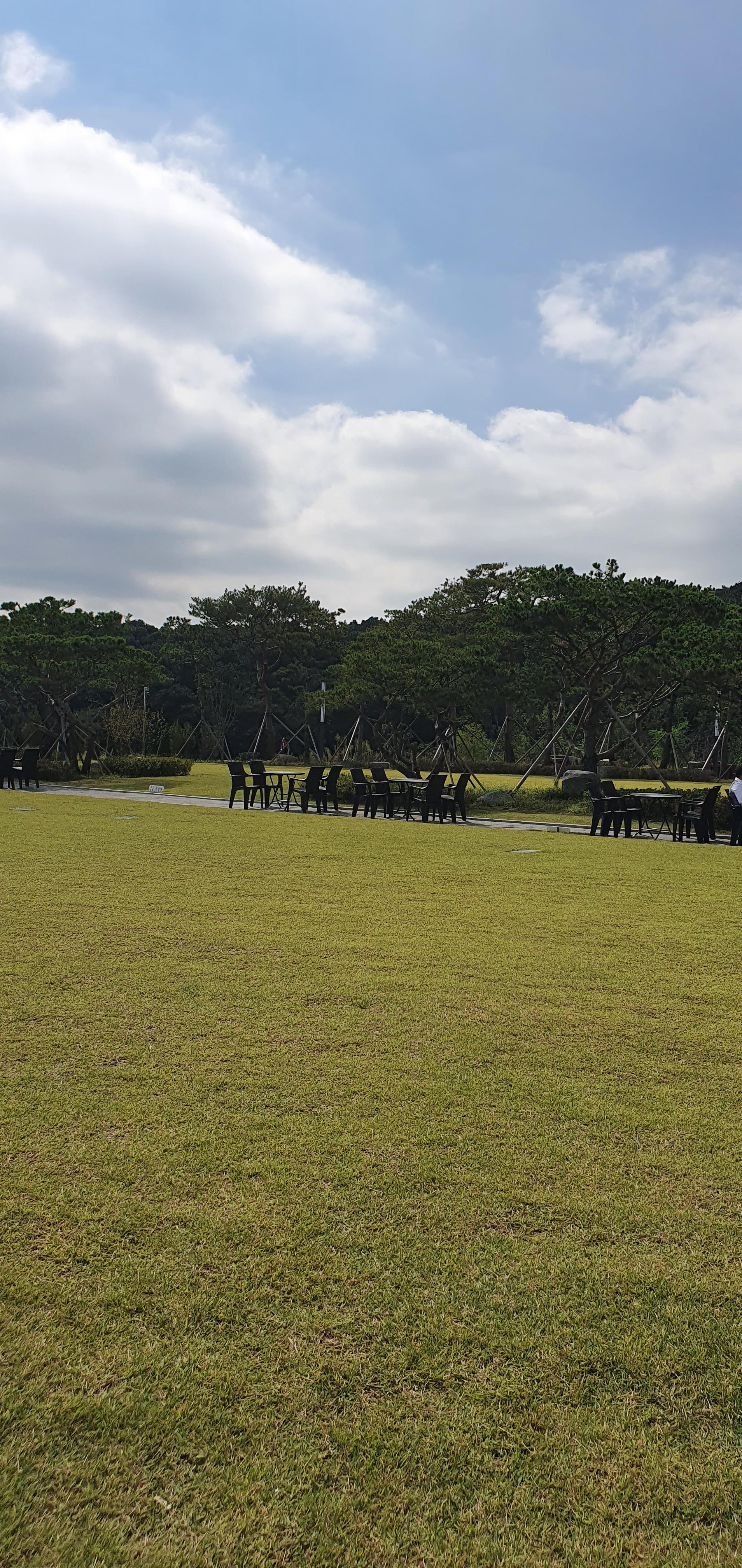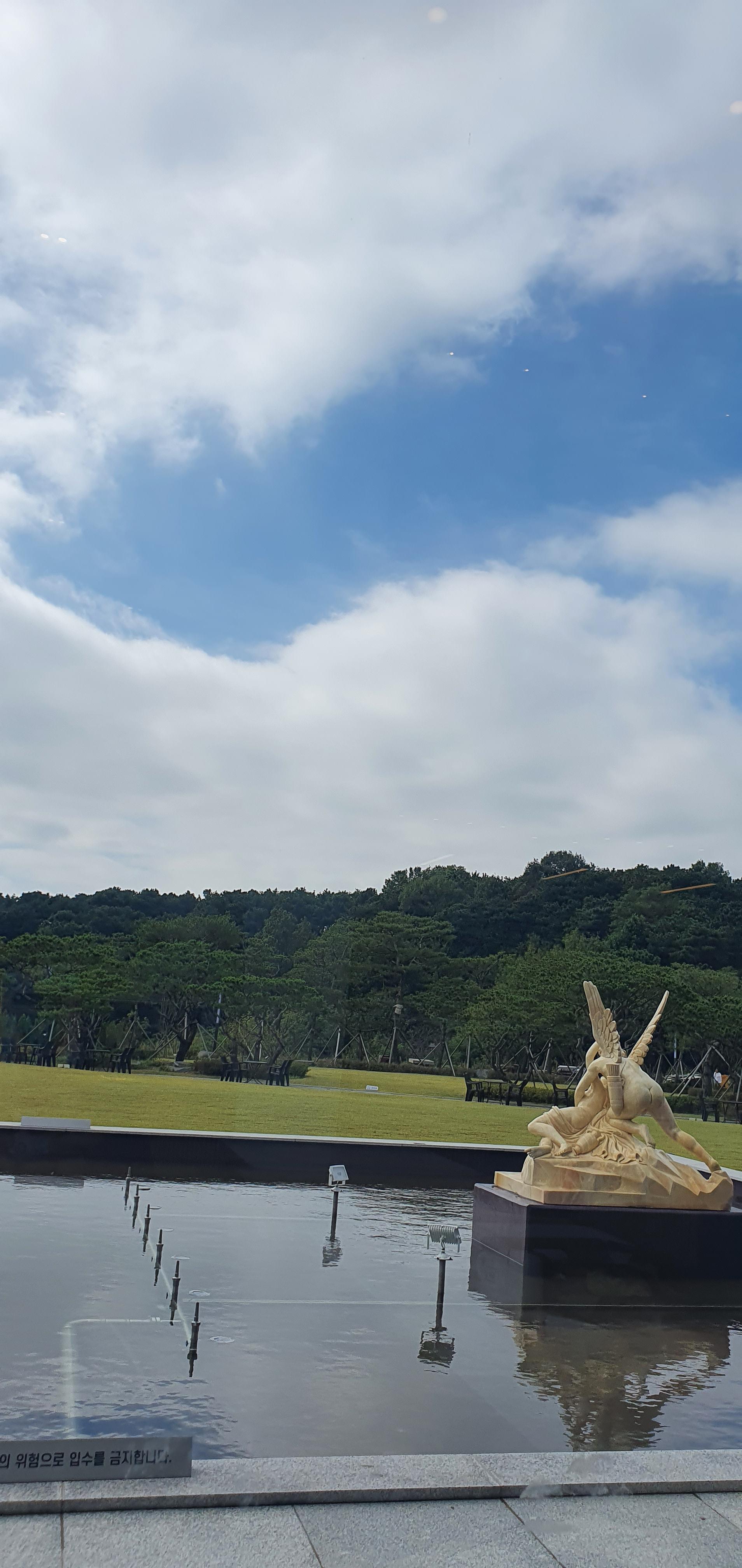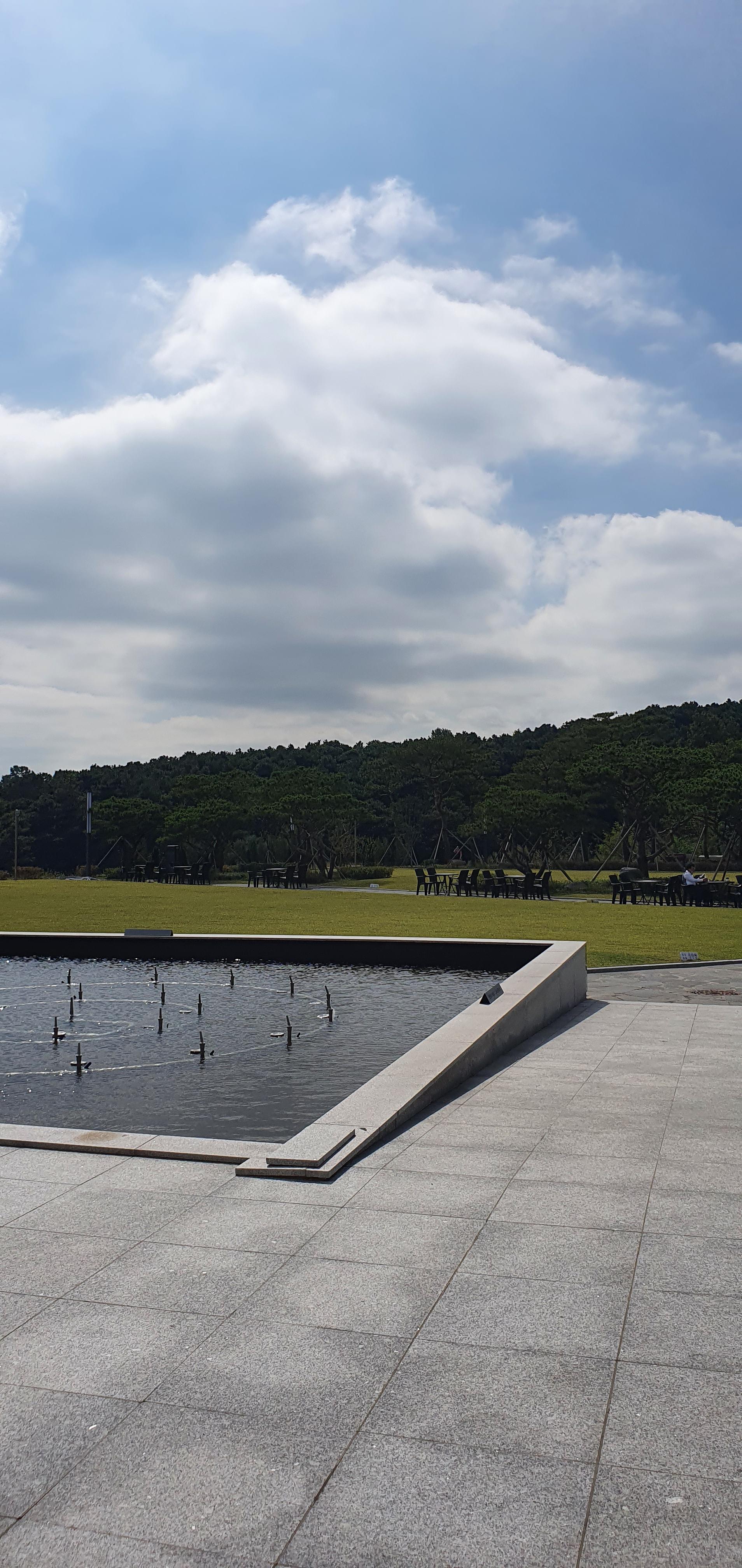 방문한 날이 하늘이 흐리다가 맑았다가를 반복했던 날이었어요. 흐리면 흐린대로 운치 있고 맑으면 파란 하늘을 볼 수 있어서 좋았어요. 내부에서 바로 보는 카페 야외 전경도 멋졌어요. 카페 메르오르는 잔디밭이 넓어서 아이들이 뛰어놀기 좋아요. 야외테이블도 세팅되어 있고 분수도 있어요. 조그마한 오두막도 있었는데 포토존으로 많이들 찾을 것 같아요.