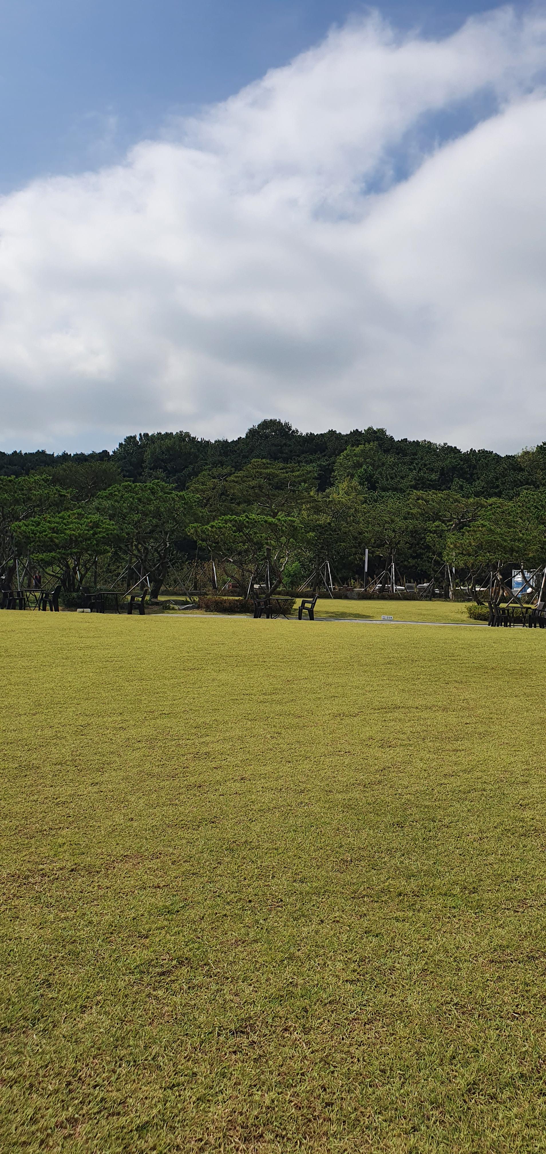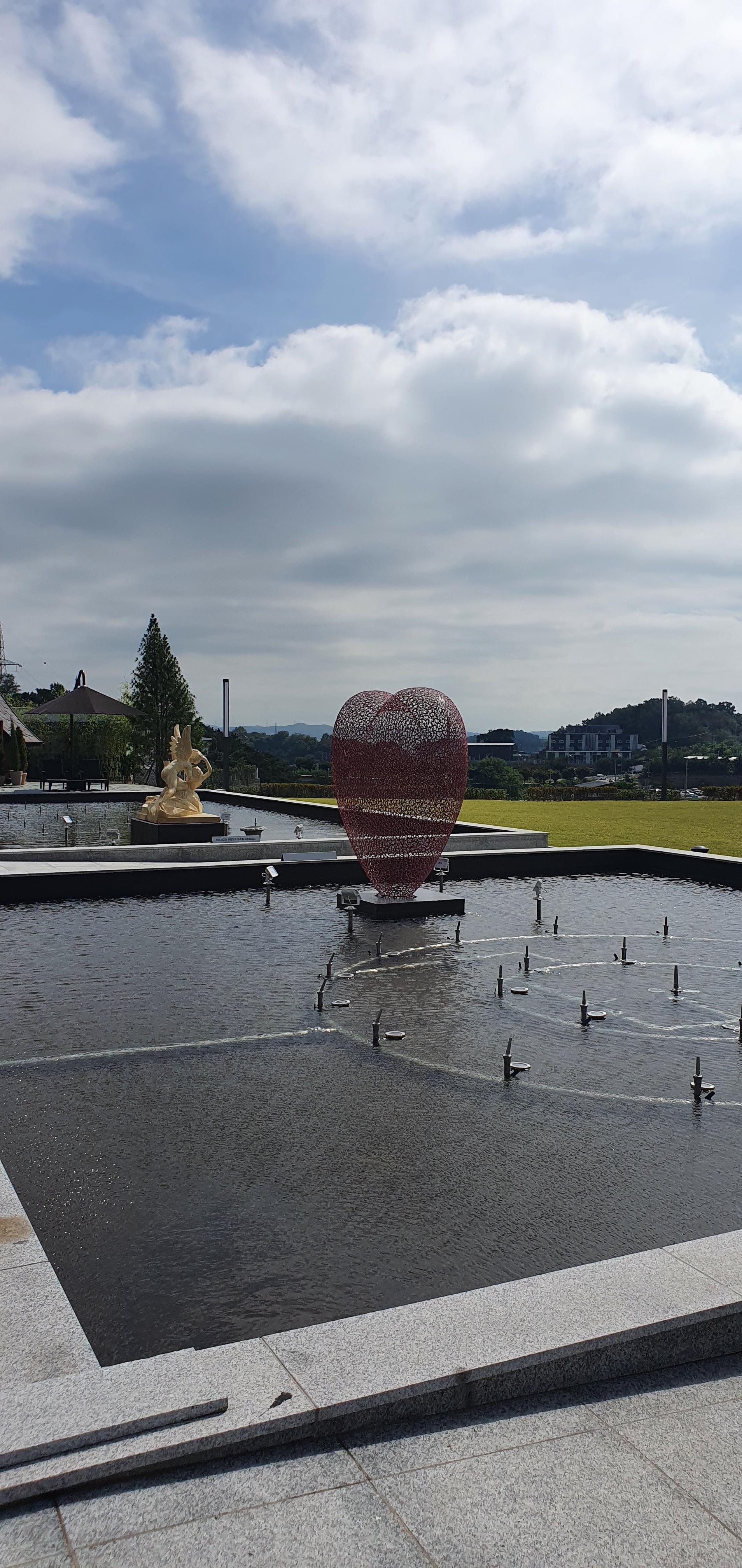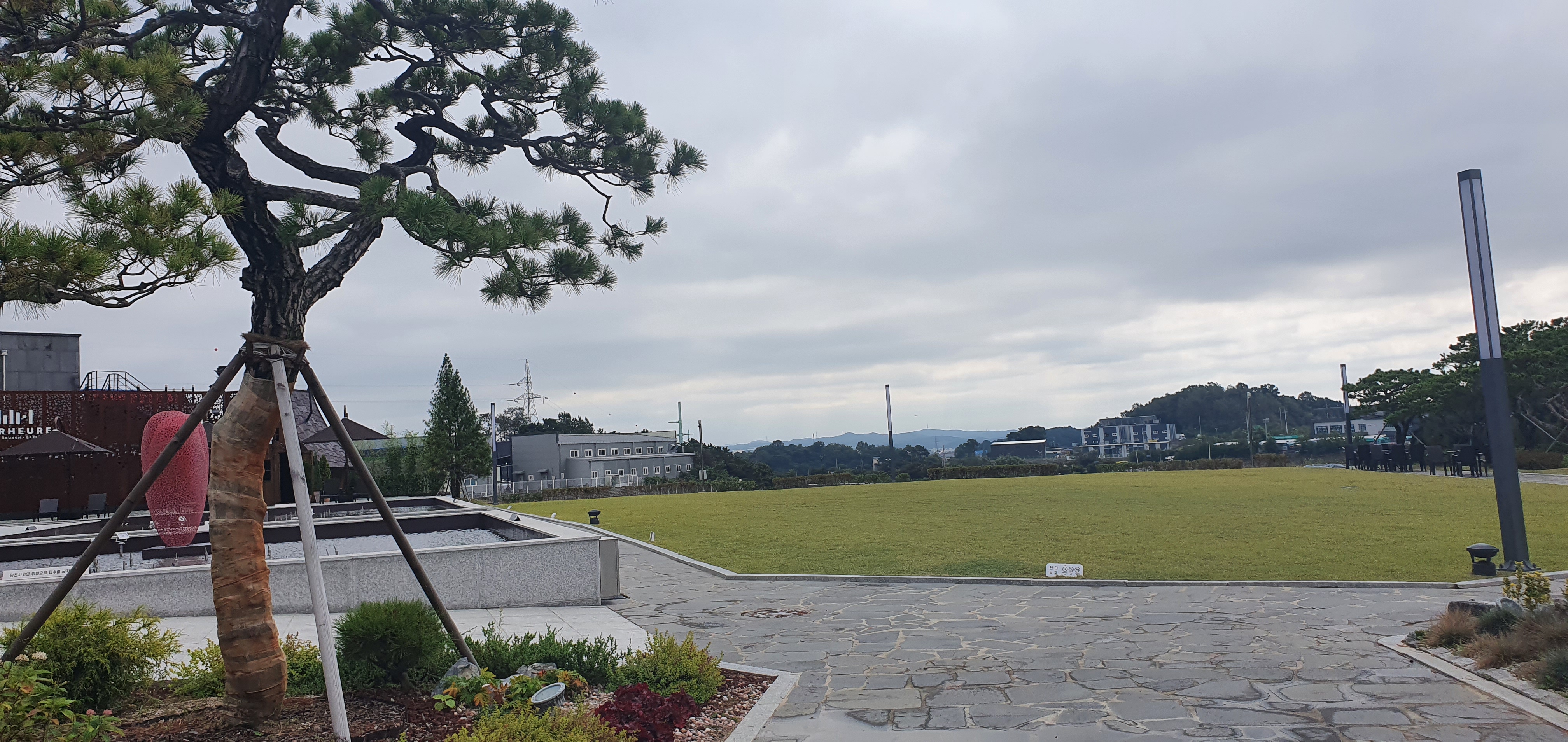 방문한 날이 하늘이 흐리다가 맑았다가를 반복했던 날이었어요. 흐리면 흐린대로 운치 있고 맑으면 파란 하늘을 볼 수 있어서 좋았어요. 내부에서 바로 보는 카페 야외 전경도 멋졌어요. 카페 메르오르는 잔디밭이 넓어서 아이들이 뛰어놀기 좋아요. 야외테이블도 세팅되어 있고 분수도 있어요. 조그마한 오두막도 있었는데 포토존으로 많이들 찾을 것 같아요.