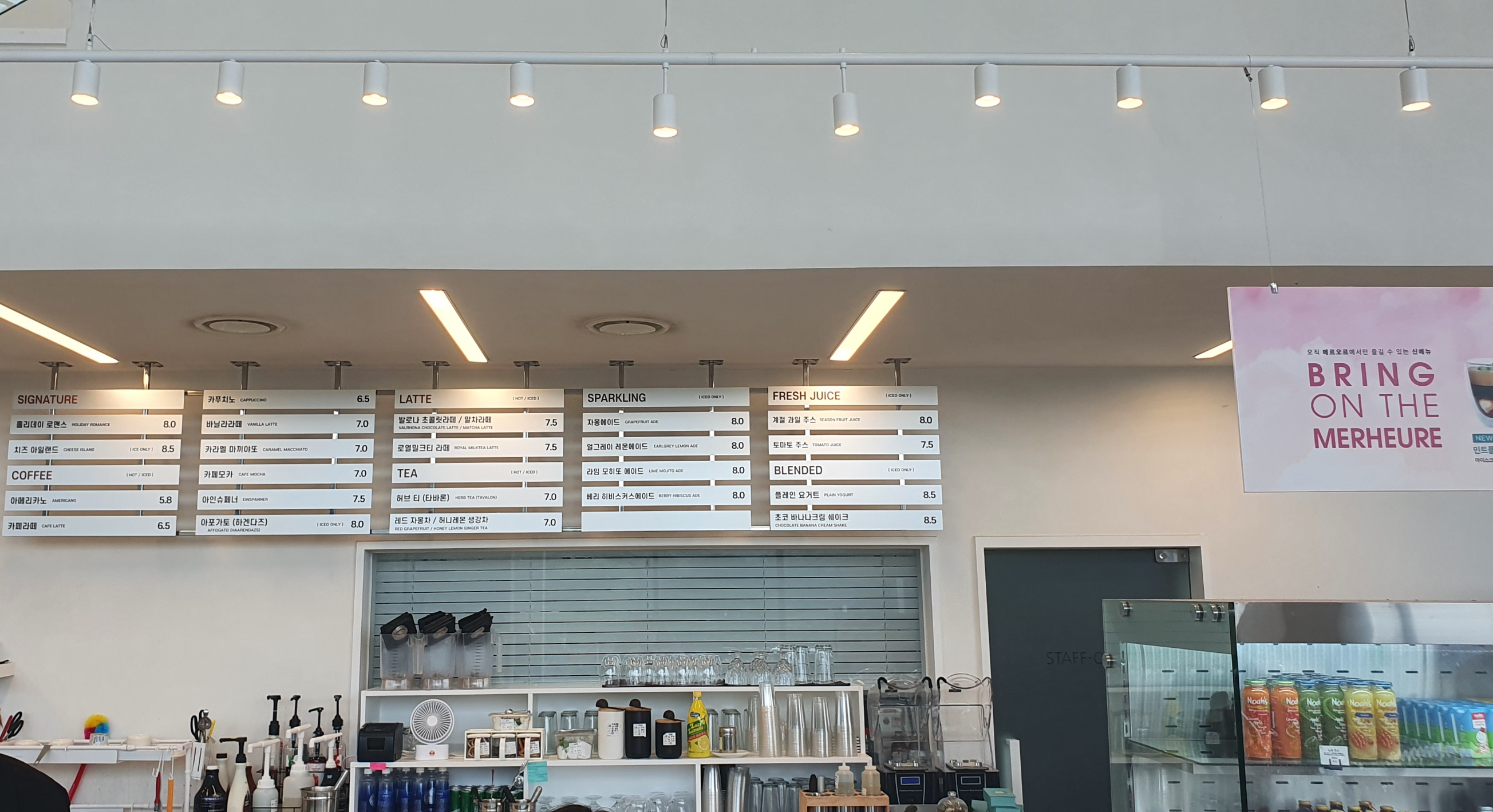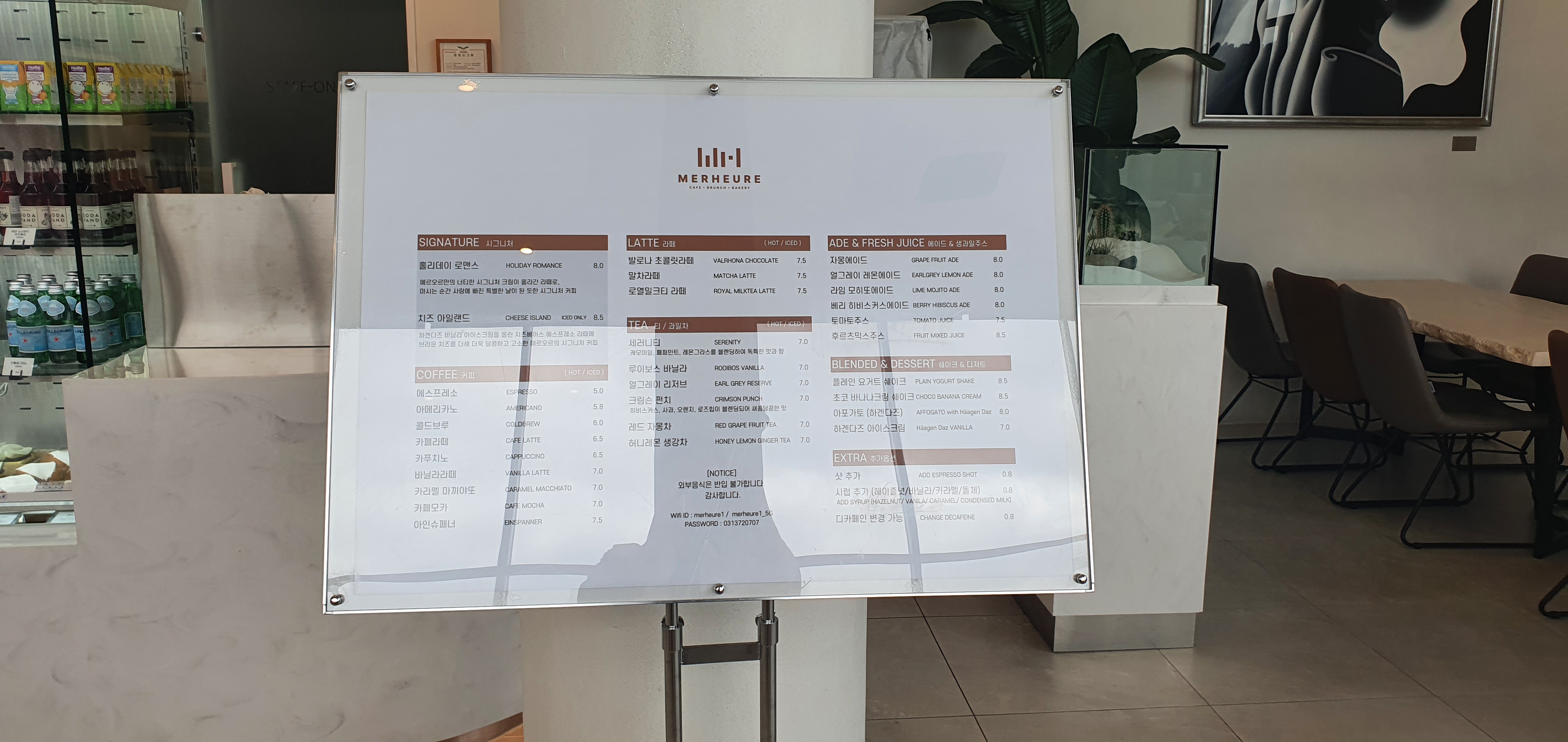 카페 메르오르 입구 초입에는 상세메뉴판이 놓여 있었어요.