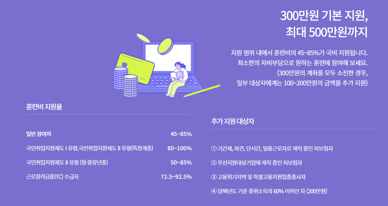국민내일배움카드는 1인당 300~500만 원까지 지원되고 훈련비의 45~85% 지원해요.