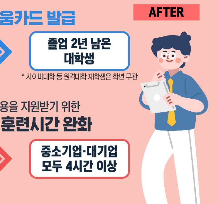 카드 사용 대상자는 신청자 본인과 19세 이상 가족, 그리고 이웃, 지인 등을 비롯한 특정 대상자를 추가적으로 신청자의 카드로 등록할 수 있습니다. 카드 사용으로 교육비용에 대한 일정 비율의 비용을 지원받아서 교육을 수료하면 각 기업에 따라 일자리 취약 지역을 선정하고 그 지역 내에 취업 기회를 제공하는 등의 혜택을 받으실 수 있어요.