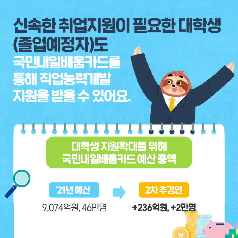 평생직장의 개념이 사라지는 요즘 시대이지요. 더 나은 미래를 준비할 수 있도록 국가에서 지원해주는 제도 중 하나가 '국민내일배움카드'라고 생각되는데 국민내일배움카드를 적극적으로 활용하셔서 혜택과 지원 꼭 받으세요!
