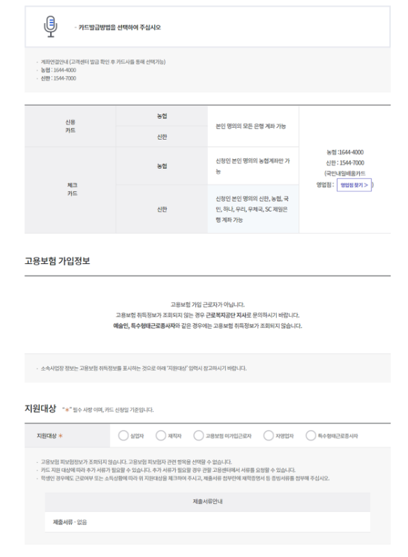 신분증, 근로계약서, 증빙서류 등 필요한 서류를 지참해 고용센터 방문하여 카드 발급을 신청합니다.