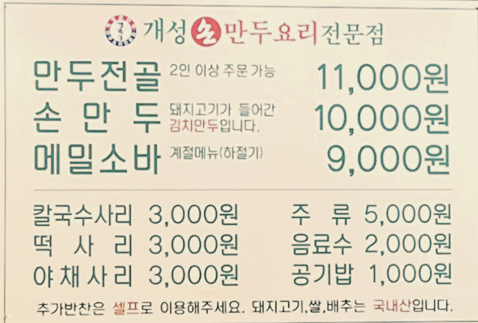 개성 손만두 만두전골은 1인분에 11,000원이에요. 2인이상 주문가능하며 손만두는 10,000원이에요. 겉 간판은 오래되어 보였는데 매장 안은 넓고 깔끔했어요.