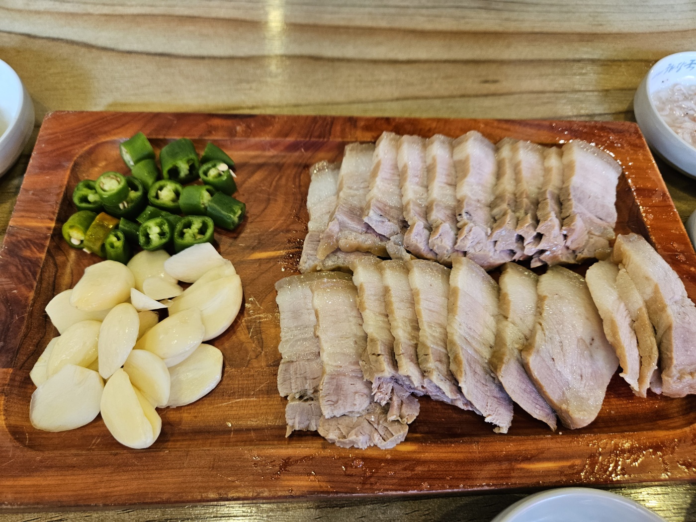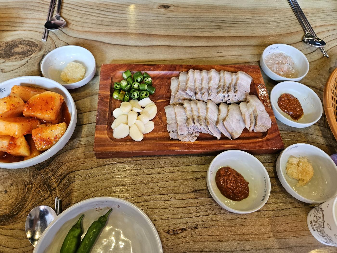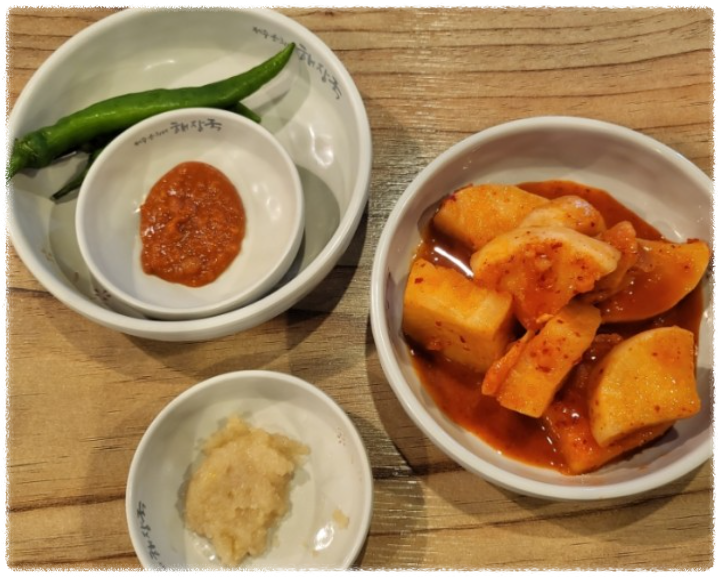 은희네 해장국 밑반찬은 아주 심플했어요. 깍두기무, 매운 고추, 쌈장과 다진 마늘이 밑반찬으로 나와요.