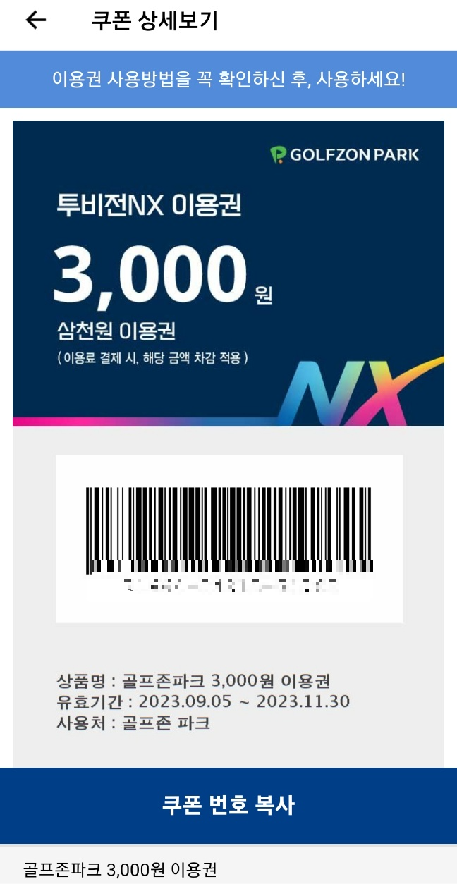 평소 스크린 골프를 즐기는 저로서는 골프존 nx의 그래픽, 타격소리 등의 디테일의 매력에 빠져서 가격이 조금 더 비싸더라도 골프존 nx에 계속 가서 스크린 골프를 즐길 생각을 하고 있습니다. 참고로 골프존에서 골프존 투비전 nx할인 3000원 이용권을 제공(기한 23년 9월 5일 ~ 11월 30일)하고 있으니, 기한 만료되기 전에 꼭 한번 이용해 보세요(my 메뉴에서 확인하세요).