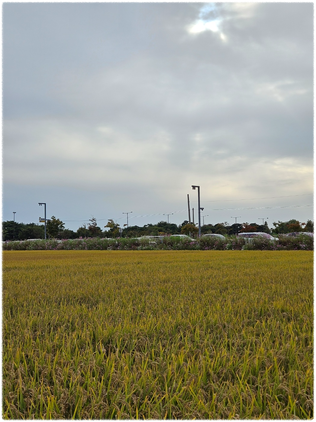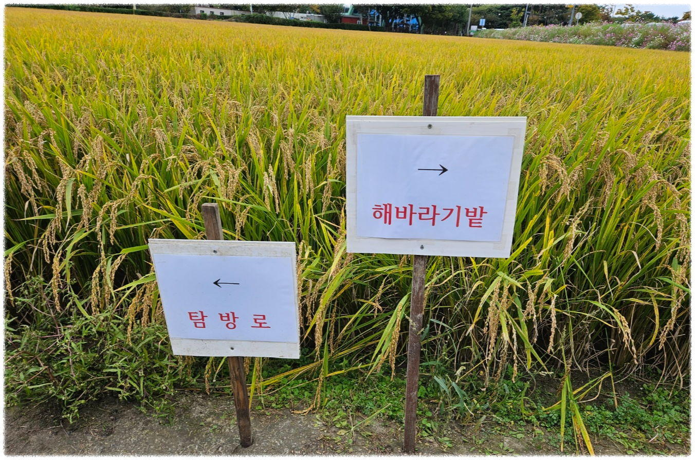 바람새 마을 핑크뮬리 옆에는 들판에 벼밭이 있었는데, 벼가 익어서 황금빛 장관을 이루고 있었어요.