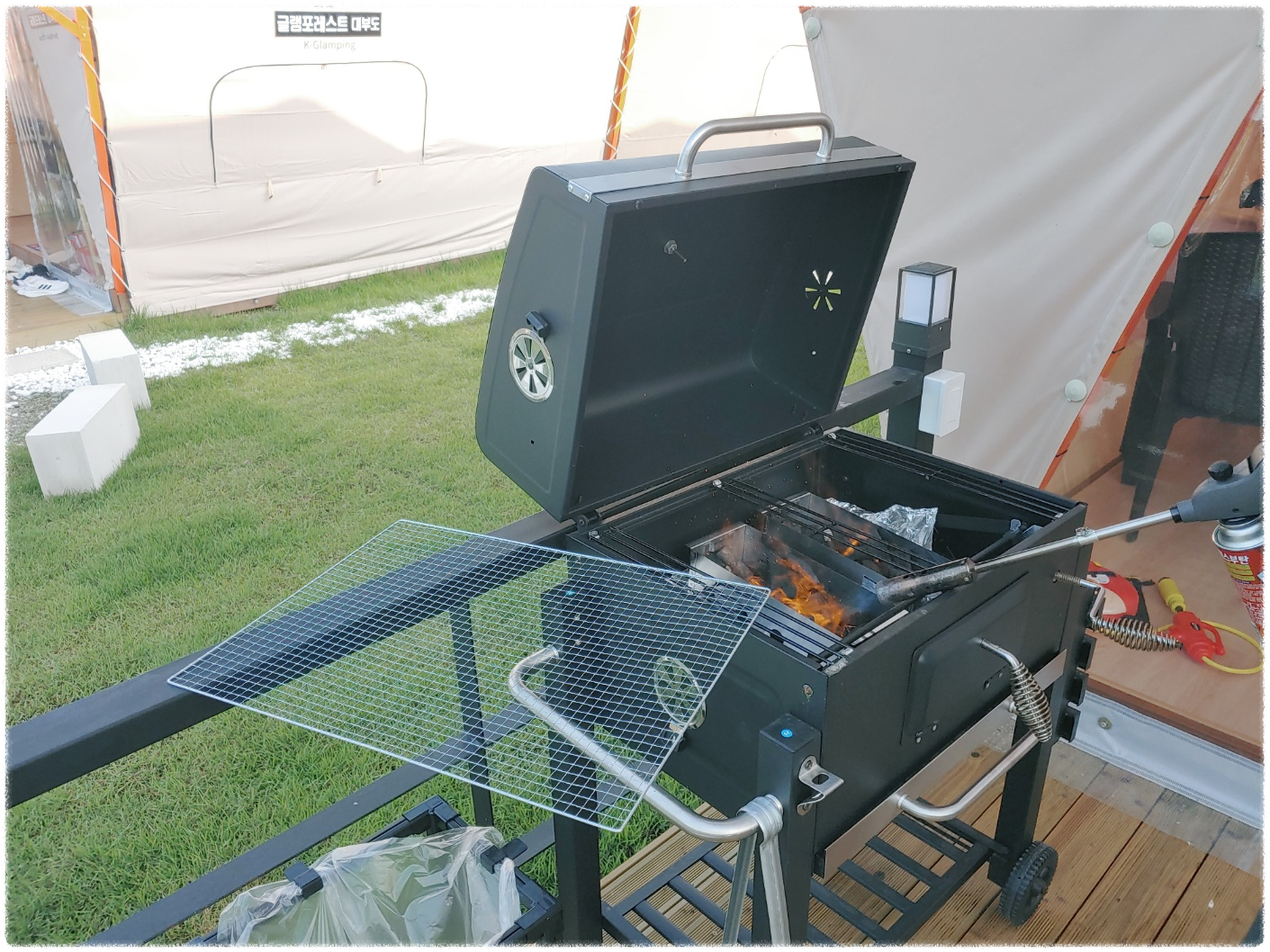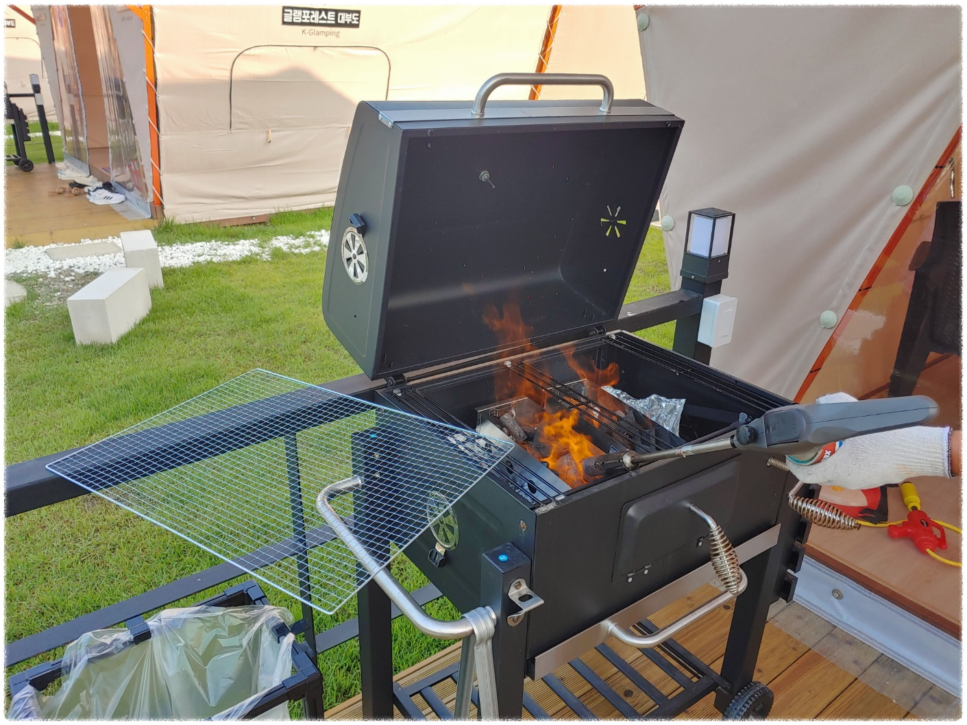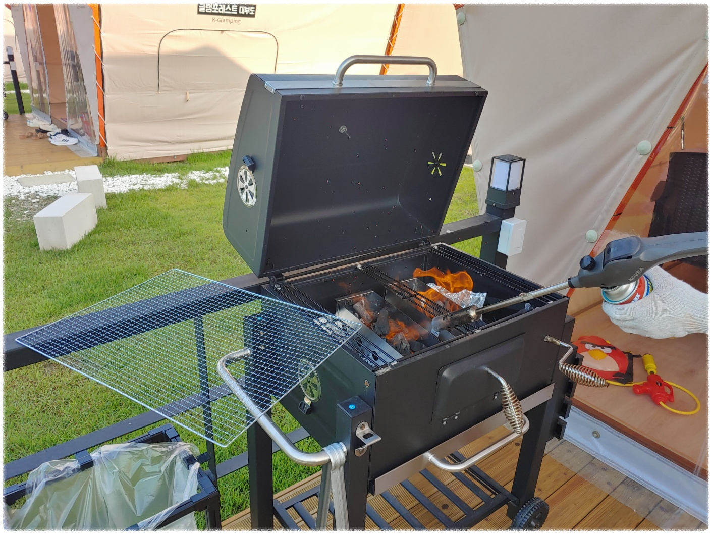 저녁시간에 맞춰서 사장님께 바베큐 그릴 세팅을 요청하면 해당 요청 시간에 맞춰서 바베큐 그릴을 이용할 수 있게 준비해 줍니다. 바베큐 그릴을 이용해서 마시멜로, 소시지, 고기를 맛있게 먹을 수 있었어요.