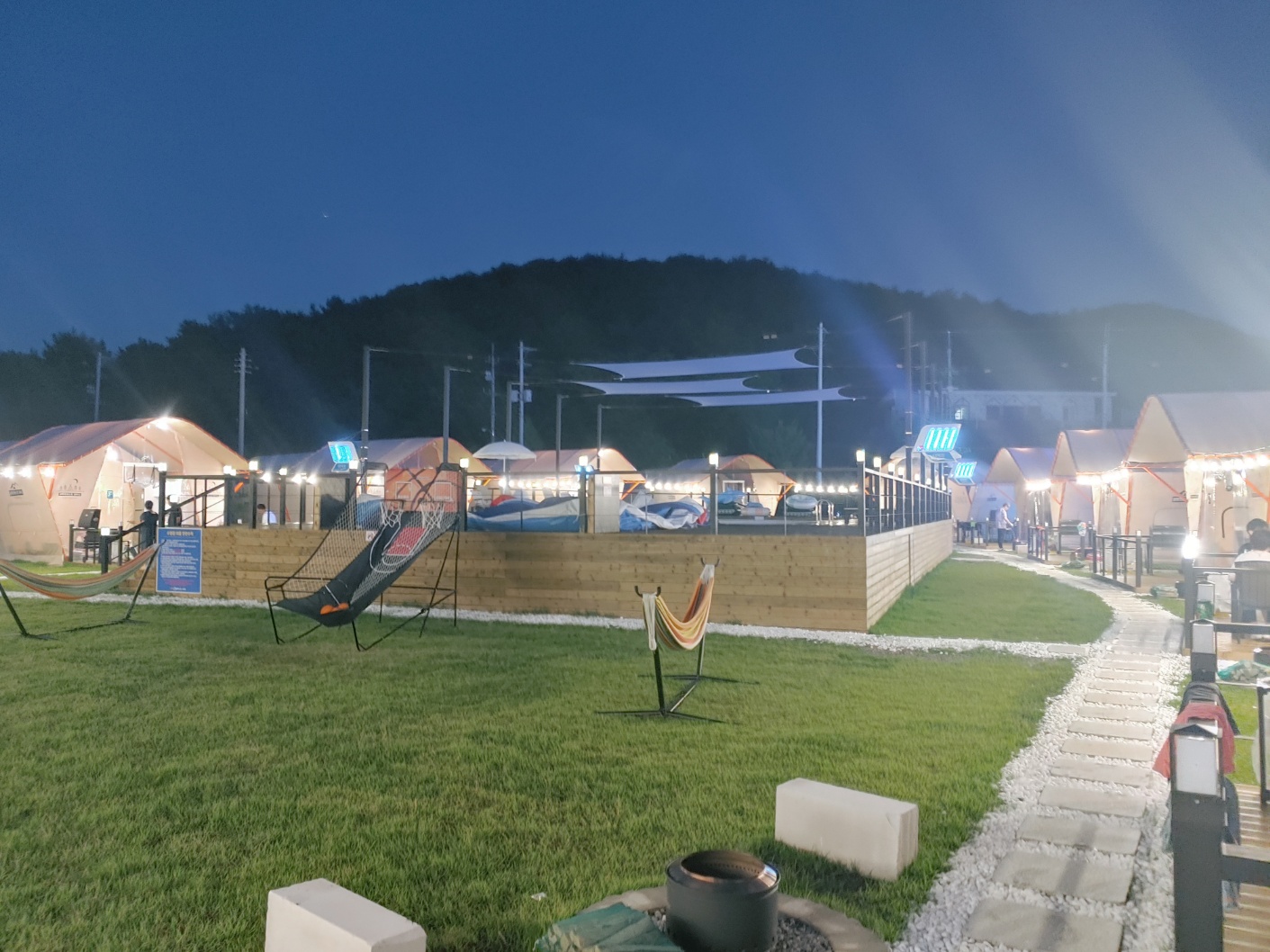 대부도 글램핑 글램포레스트에 어느덧 밤이 찾아왔네요(대형 워터슬라이드가 사라짐). 글램포레스트의 야영장에는 크지 않은 잔디광장, 어린이용 농구대 그리고 해먹이 있었어요. 아이들과 농구골대에 농구공을 던지며 놀이도 했고, 해먹에서 편안히 휴식을 취하며 시간을 보낼 수 있어서 좋았어요.