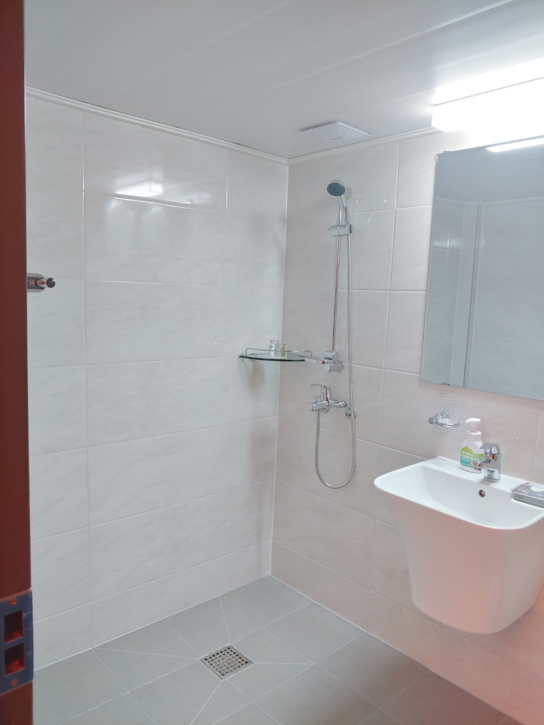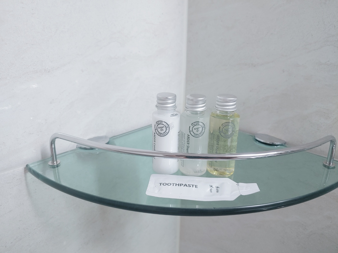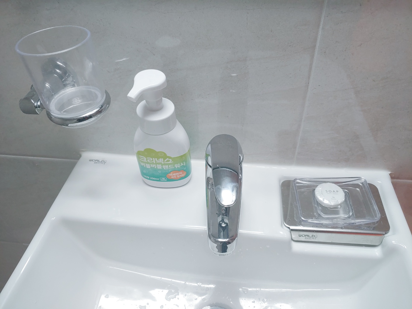 개별 화장실도 아주 깔끔했어요. 화장실에는 기본적으로 샴푸, 린스, 바디워시, 치약, 비누, 핸드워시 등이 비치되어 있었어요. 아이들과 같이 가실 분들은 아이들용 세면도구는 챙겨가시는 게 좋을 거 같아요.