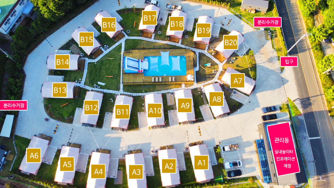 대부도 글램핑 글램포레스트는 총 20개 동이 있어요. 수영장과 야영장을 중심으로 14개의 동(A7~10동, B11~20동)이 위치하고 있으며, 관리동 앞쪽으로 프라이빗한 6개 동(A1~A6동)이 위치하고 있어요. A1~10동은 침대가 하나 있는 원베드룸, B11~20동은 침대가 두 개 있는 투베드룸이니 참고하세요. 주차장은 각 동당 개별주차장이 있어서 편리했어요. 글램포레스트 입구에는 관리동이 위치했고, 양쪽으로는 분리수거장이 각 1개씩 있었어요.