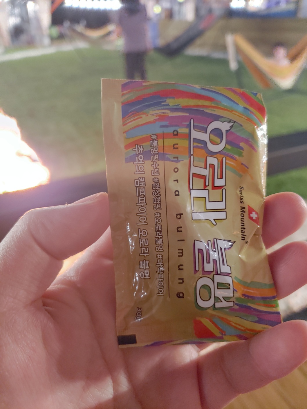 대부도 글램핑 글램포레스트에는 전화 예약 시 오로라 가루포함해서 불멍서비스(2만 원 상당)가 있었어요. 각 동 앞에 불멍을 즐길 수 있는 화로가 개별 비치되어 있어서 안전하게 불멍을 즐길 수 있었어요. 밤이 깊은 가운데 관리동에 불멍 서비스를 요청했고 직원분이 오셔서 장작에 불을 붙여 주셨어요.