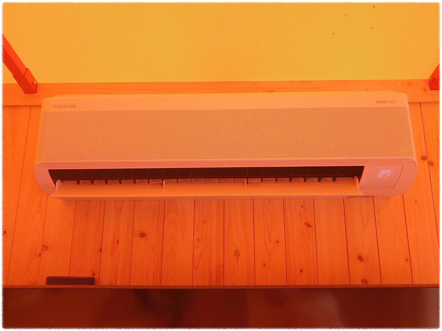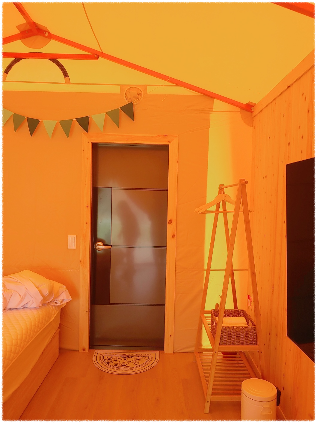 저희는 B12동에서 글램핑을 즐겼습니다. 앞서 말한 대로 침대가 2개인 투베드룸이었어요. 갔을 때는 아주 더운 초여름이었어서 에어컨이 미리 틀어져 있었어요.