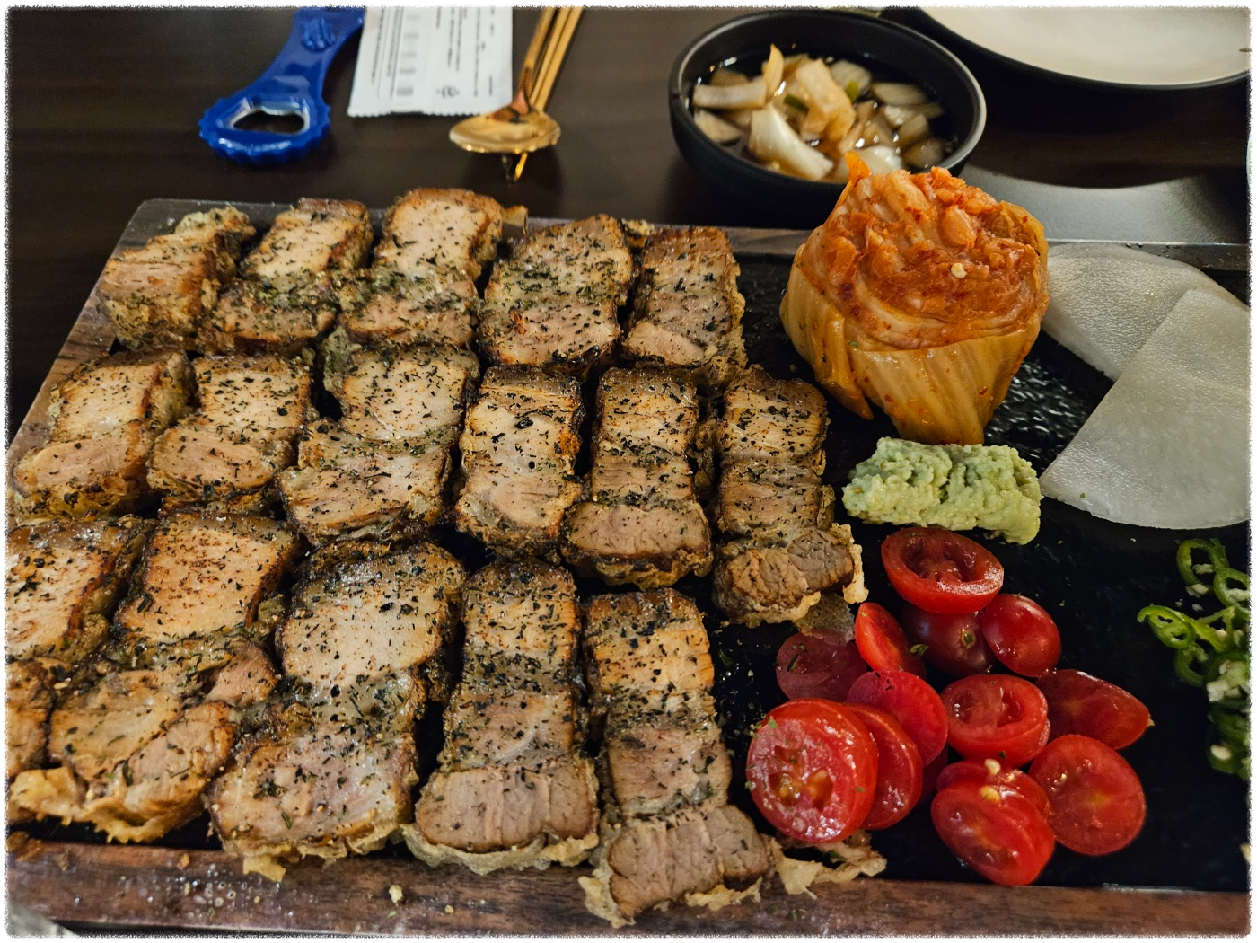 합 망포점의 대표메뉴인 수육튀김은 부드러운 수육을 튀겨내는 발상이 특이했고, 어떤 맛일지 너무 궁금했어요. 수육튀김을 주문하면, 수육튀김과 다양한 토핑(방물 토마토, 와사비, 쌈무, 청양고추, 양파간장, 묵은지 등)들이 같이 나오는데, 수육과 함께 기호에 맞게 다양한 조합으로 먹으니 무난하고 맛있었어요. 다만, 통삼겹 챠슈베이스로 삶아서 튀겨낸 수육이 두툼해서 좋기는 한데, 뻑뻑한 살들이 많아서 조금 많이 아쉬웠어요. 많은 뻑뻑한 살들을 제외하고 간간이 존재하는 부드러운 고기들은 맛있었어요. 결론은 "화려한 비주얼에 비해 그 뻑뻑함으로 조금은 아쉬움이 남았었다"로 표현하고 싶어요.