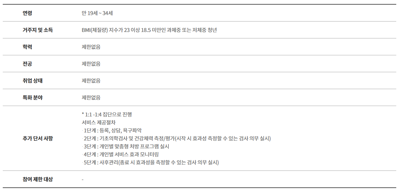 청년 PT 지원제도 신청자격은 만 19세에서 34세 청년으로 BMI(체질량) 지수가 23 이상 18.5 미만인 과체중 또는 저체중 청년이 해당됩니다. 소득 및 학력, 전공, 취업상태는 제한사항이 없습니다. 다만, BMI 체질량 지수를 증명하기 위해 건강검진결과표 혹은 보건소에서 발급한 인바디 검사 결과지가 필요하니 참고하세요.