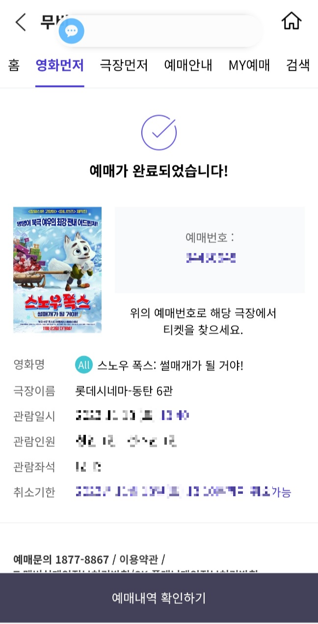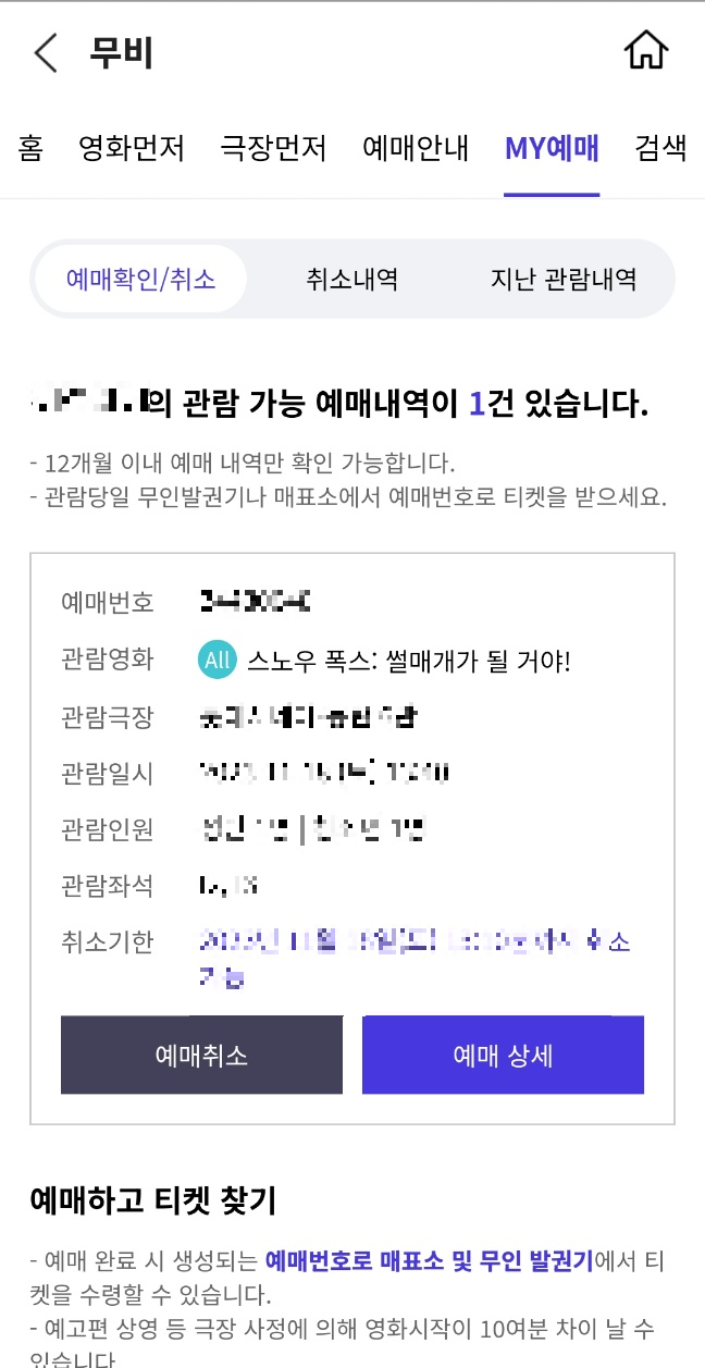 예매내역 확인하기를 선택하면, 아래와 같이 예매한 내용을 확인할 수 있으니 참고하세요.