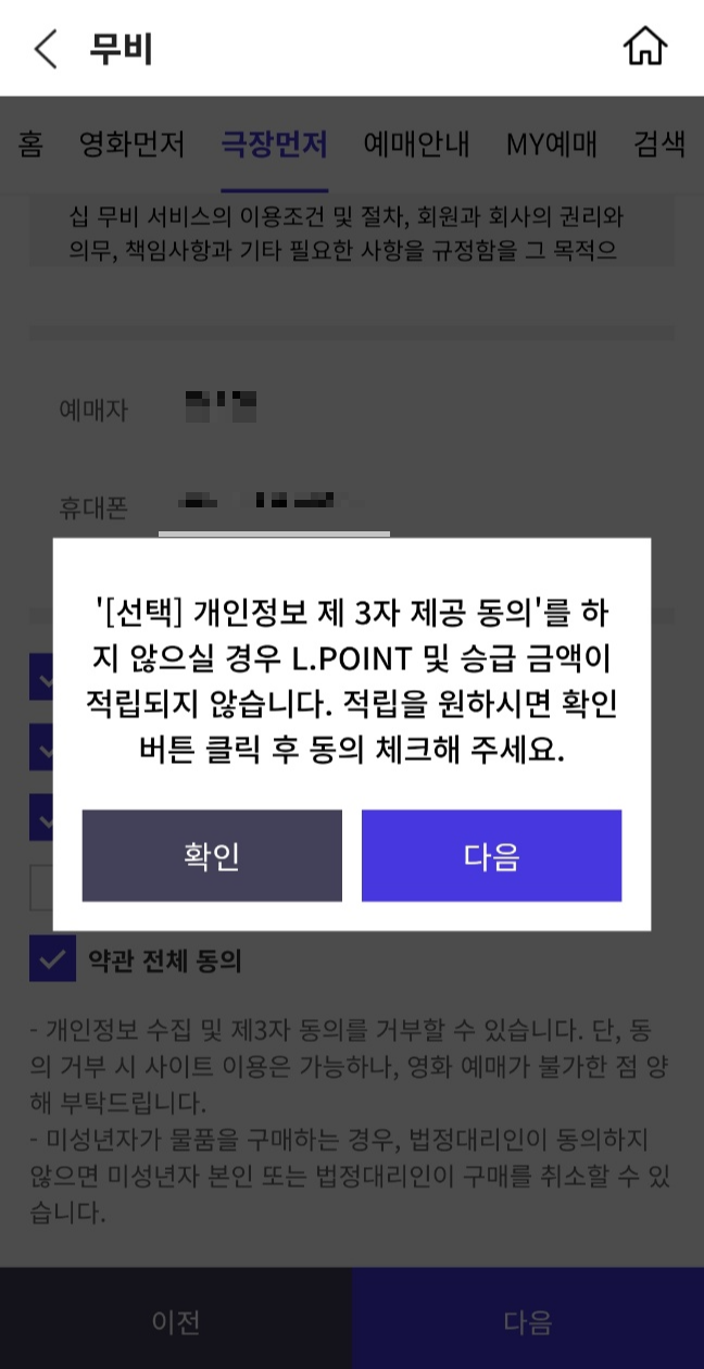 좌석을 선택하고, 다음버튼을 누르면 아래와 같이 예매결과 전송용 정보확인 화면이 나올 거예요. 필수란에 체크한 후, 다음 버튼을 눌러주세요.
