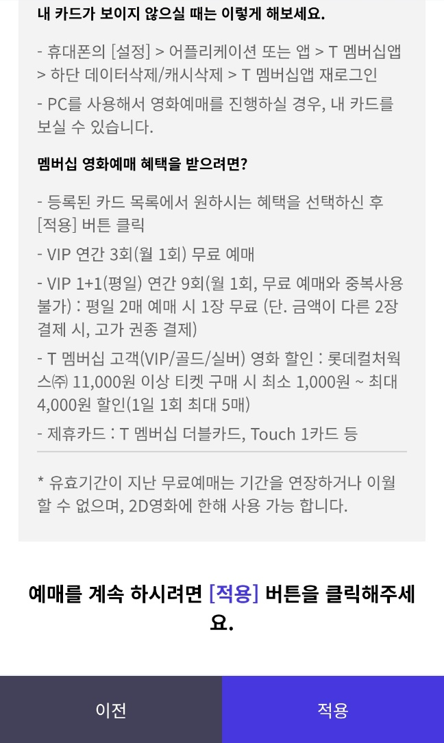 예매결과 전송용 정보확인을 하시면 아래와 같이 SKT 멤버십 영화 무료예매 혜택 사용 화면이 나올 거예요. 여기서 년 3매의 VIP 무료 예매(1매 무료) 혹은 년 9매의 VIP 1+1(평일) (2매 예매 시 1장 무료) 혜택을 선택하시고 적용버튼을 눌러주세요.
