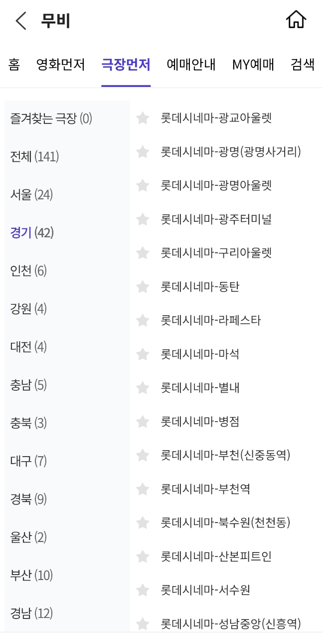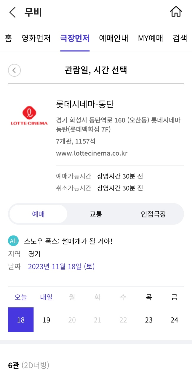 무비 홈화면에서 영화 예약을 하실 때에 편의에 따라 "영화먼저" 혹은 "극장먼저"를 선택하시고 예약을 진행하시면 돼요. 저희 같은 경우 "극장먼저"를 선택해서, "롯데시네마-동탄" 장소를 먼저 정하고, 해당 극장에서 상영 중인 영화가 무엇인지를 보고 예매를 선택했어요.