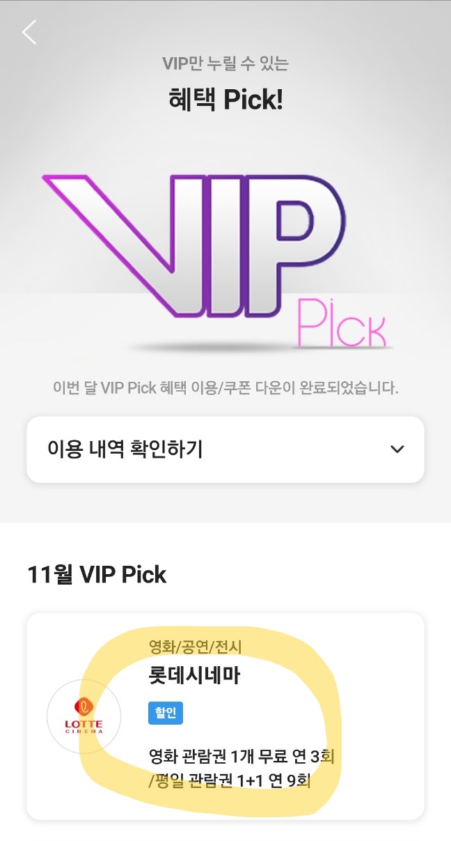 SKT VIP Pick에 들어가시면 여러 가지 혜택이 나와요. 영화를 안 보는 달에는 다른 쿠폰을 이용하셔도 되니 참고하세요. 무료영화 예매 혜택을 이용하실 분은 아래와 같이 롯데시네마 혜택을 선택하세요.