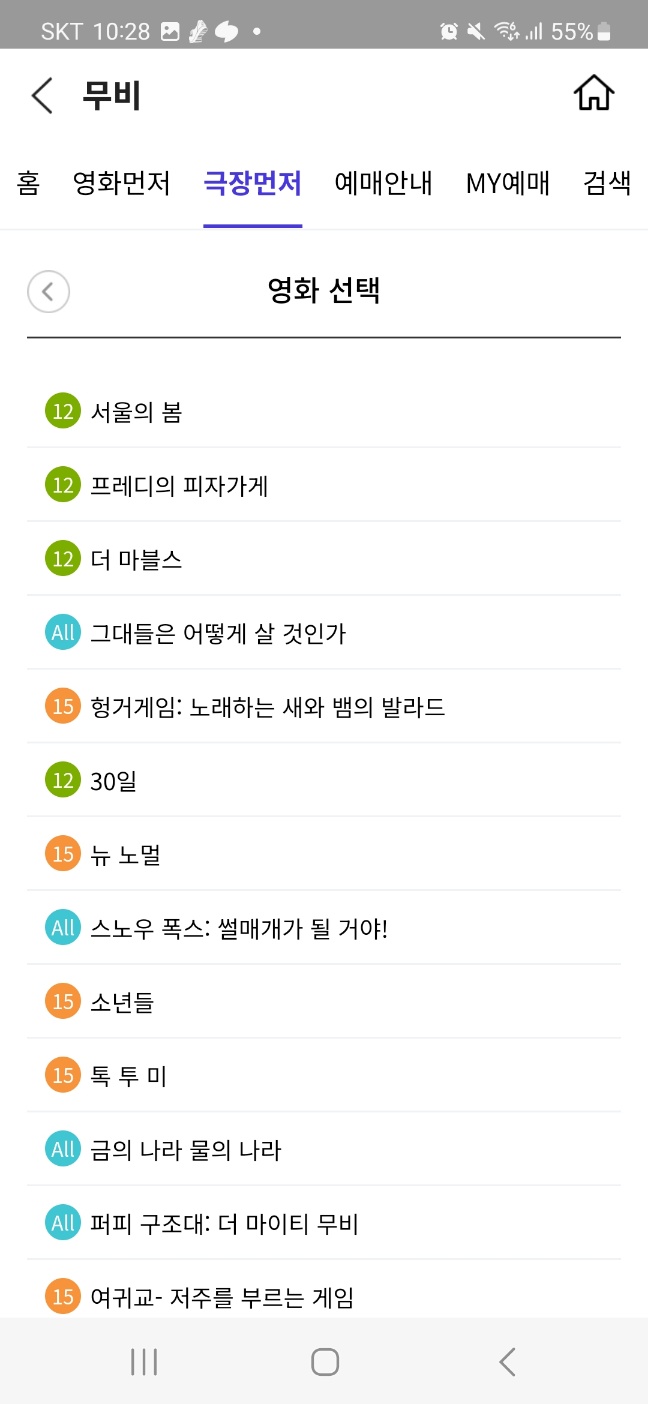 아래와 같이 무비의 홈 화면이 나오면서 현재 상영 중인 영화의 리스트가 나옵니다.