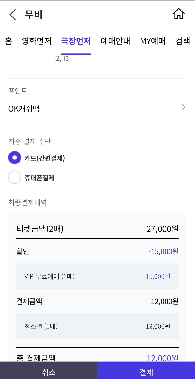 무료예매 적용버튼을 누르셨다면, 아래와 같이 VIP 무료예매(1매)가 되어 있는 걸 확인할 수 있으실 거예요. 저는 2매(성인 1매, 청소년 1매)를 구매해서 1매는 무료혜택을 이용했고, 1매만 결제해서 영화를 보았습니다.