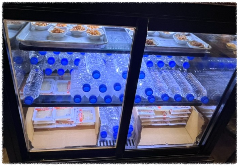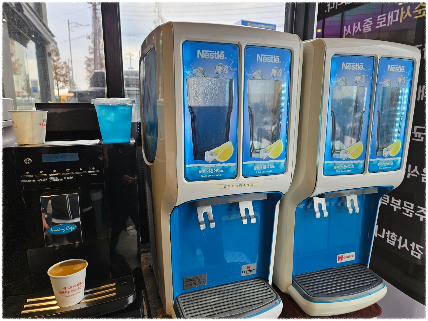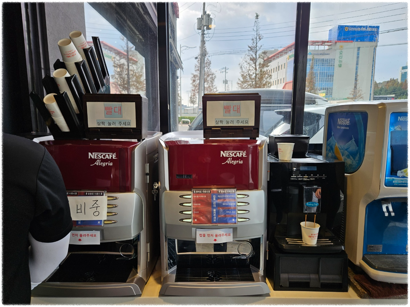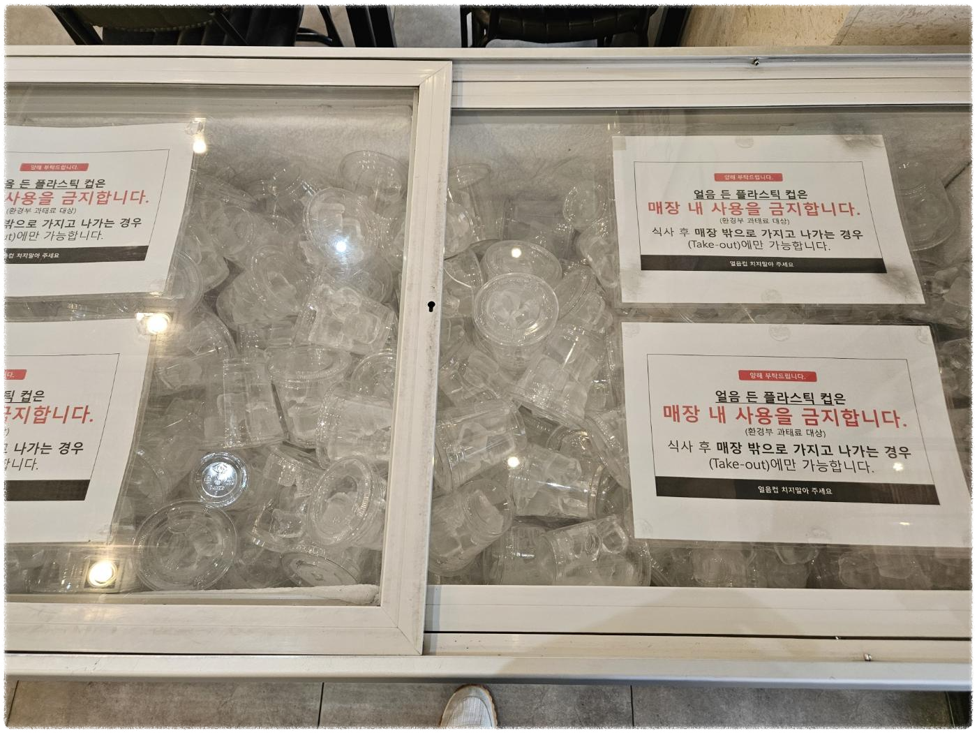 마지막으로 매장입구에는 1인당 1컵에 한하여 take out 할 수 있는 얼음컵과 커피 및 음료가 마련되어 있어요. 커피, 초코 혹은 음료 중 원하시는 메뉴를 골라 후식으로 드실 수 있으니 참고하세요.