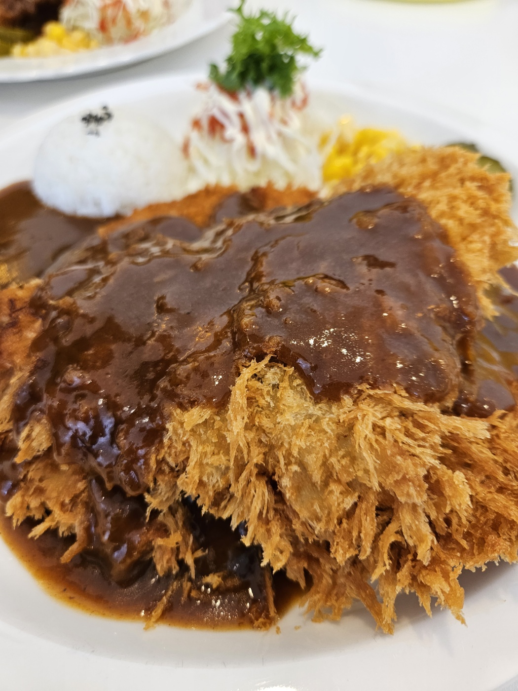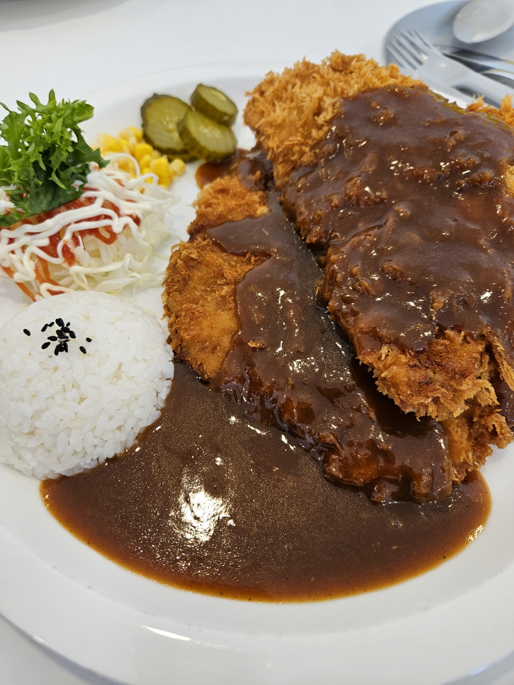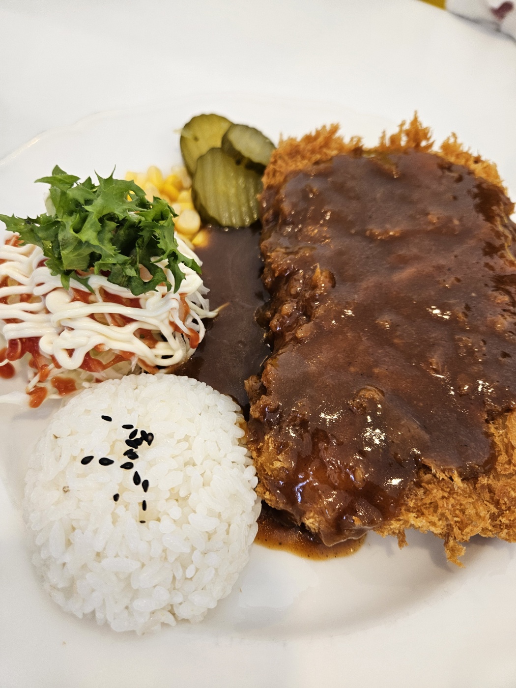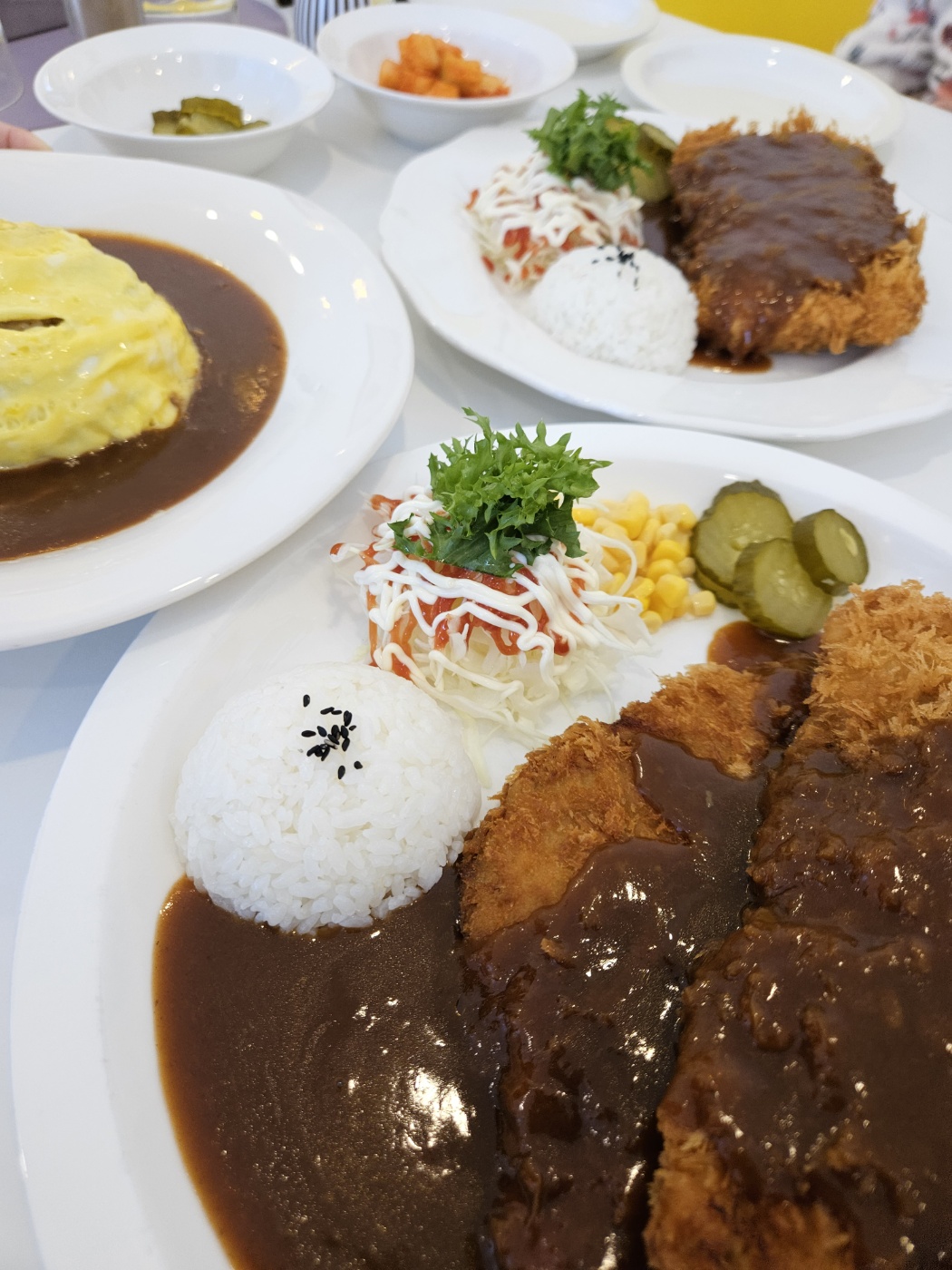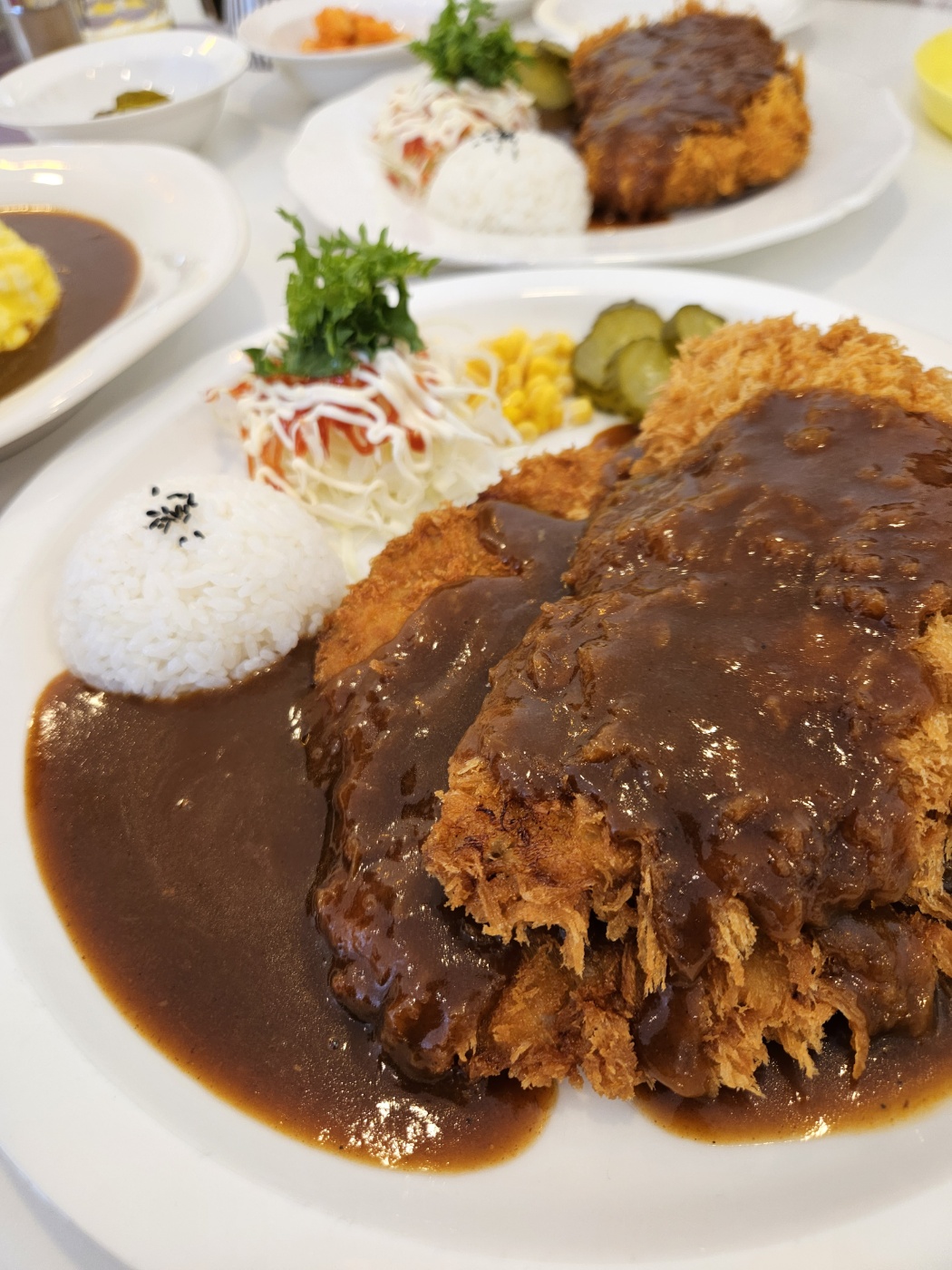 그리고 얼마 지나지 않아 메인 요리 양이 어마무지한 점보 돈가스와 치즈돈가스, 오므라이스가 나왔습니다. 점보사이즈의 돈가스는 사진상으로는 양이 적어 보이지만, 실제로는 돈가스가 크고, 양이 정말 많아요.