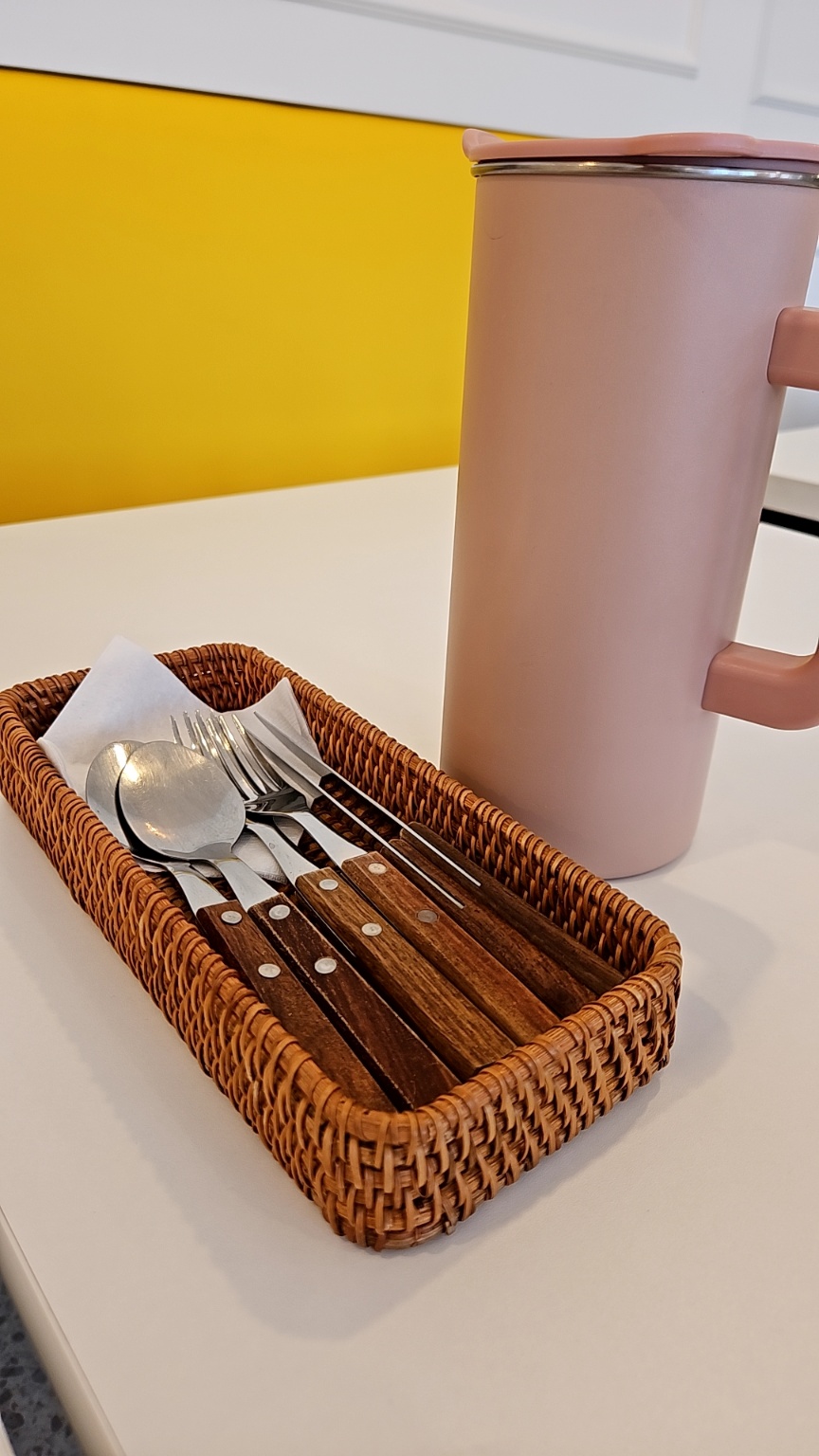 저희는 돈가스 점보사이즈(5천 원 추가), 치즈돈가스, 오므라이스를 주문했어요. 음식 나오기 전, 아래의 사진과 같이 식기가 먼저 세팅이 돼요. 어린이용 식기도 따로 주니 참고하세요.