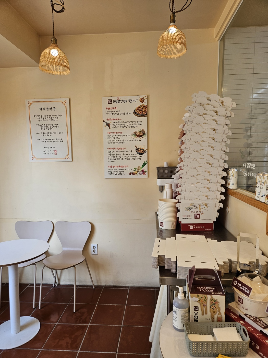 매장 내부로 들어가니 테이블이 하나정도 있는 규모로 생각보다 크지 않았어요. 포장박스들이 가득히 쌓여있는 걸 봐서는 매장에서 먹는 것보다는 아마 유일닭강정은 포장 혹은 배달주문 위주로 운영하는 거 같았어요(알아보니 택배로도 배송한다고 하네요). 실내와 주방은 심플하고 깔끔했어요.