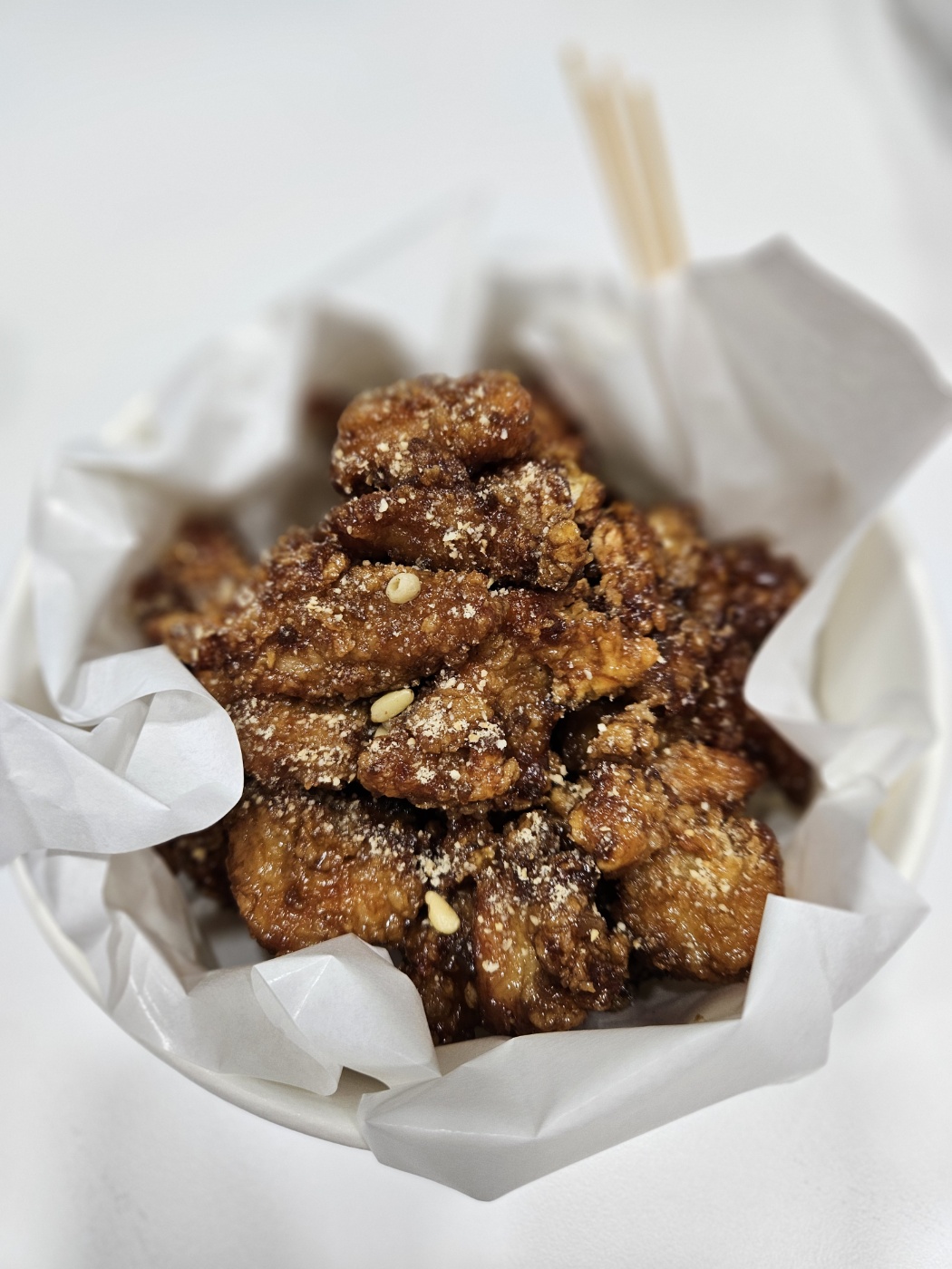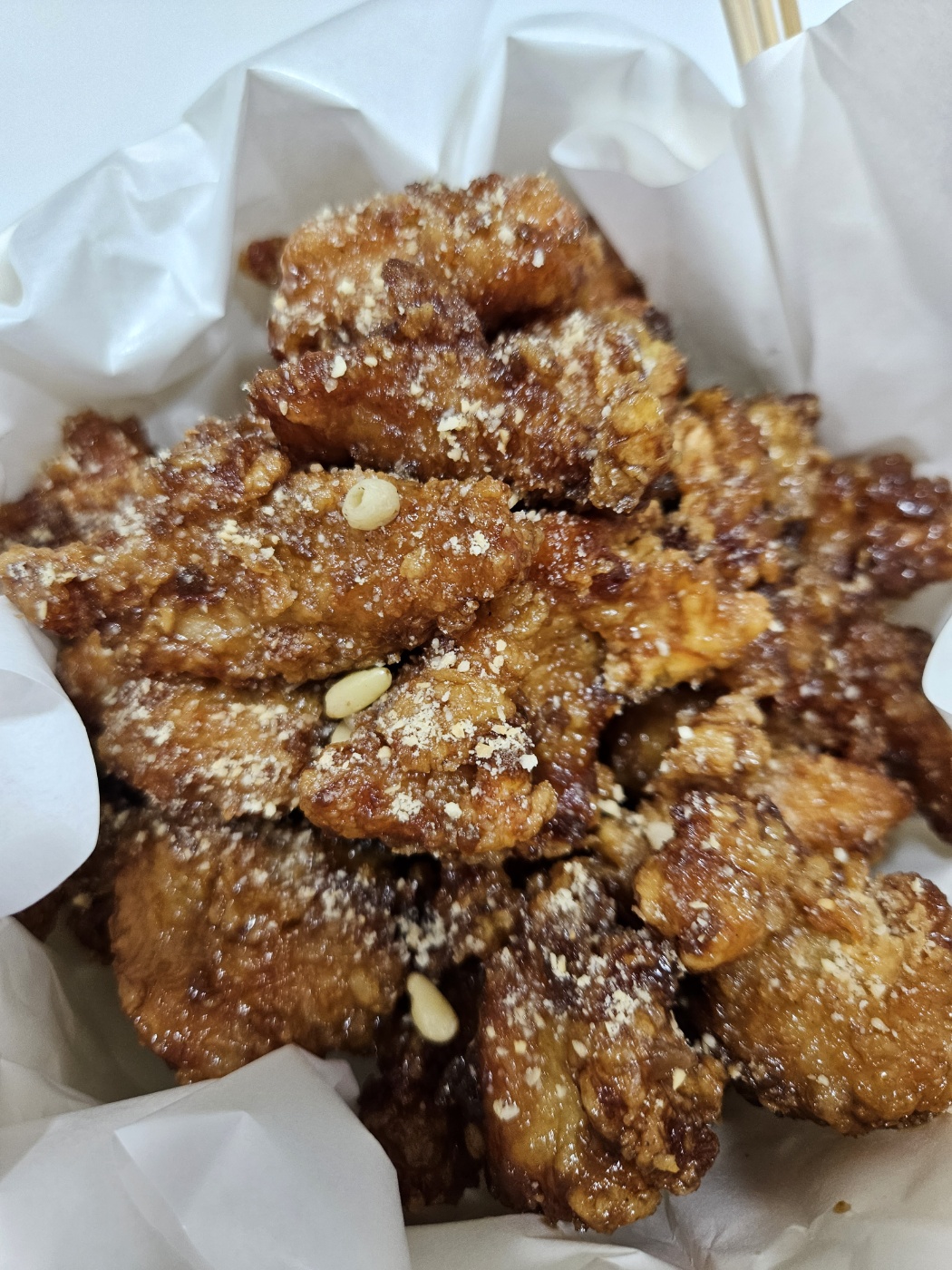 다른 후기에는 직접 개발한 크리스피 튀김법으로 튀겨서 바삭바삭하다는데, 저희는 이동 중에 식어서 그런지 그런 특유의 바삭함은 없었어요. 하지만, 적당한 튀김옷과 12가지 한약재료로 직접 개발한 특제소스로 무장한 닭강정은 너무 달지 않고, 식어도 맛있었어요.