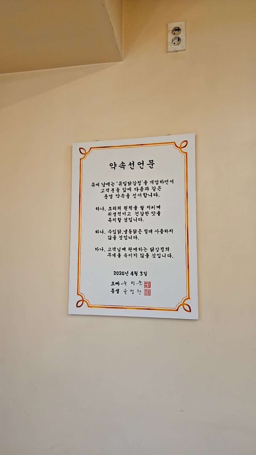가평맛집 가평 유일닭강정 내부에는 곳곳에는 유 씨 남매의 경영철학을 선언하는 약속선언문과 유일닭강정 간략한 소개 포스터가 붙어 있었어요.