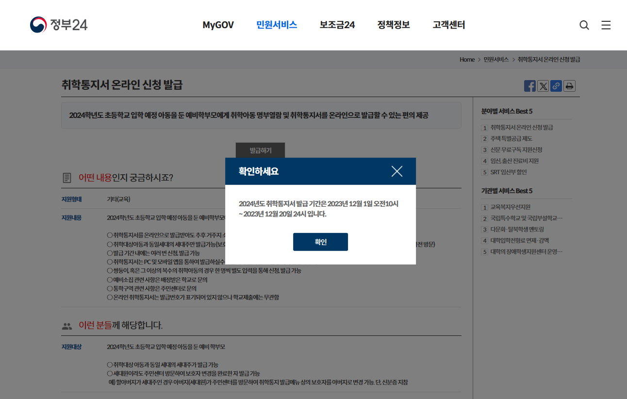 우편, 인편으로 취학통지를 받을 수 있지만 원하는 경우 정부 24 누리집에서 온라인으로 취학통지서 발급이 가능해요. 취학통지서 온라인은 초등학교 입학 예정 아동을 둔 예비학부모에게 취학아동 명부열람 및 취학통지서를 온라인으로 발급할 수 있는 편의 제공을 해요. 취합통지서 온라인 발급은 세대주만 가능하며, 발급기간동안 세대주가 정부 24시에 취학통지를 검색한 후 신청, 발급할 수 있어요. PC에서만 가능하고 모바일 앱으로는 서비스가 제공되지 않아요. 현재는 온라인 발급기간이 지나서 취학통지서를 분실했을 경우에 주민센터를 방문하면 재발급이 가능하며, 방문 시에는 신분증(주민등록증, 운전면허증 등)을 꼭 지참해야 하니 참고하세요.