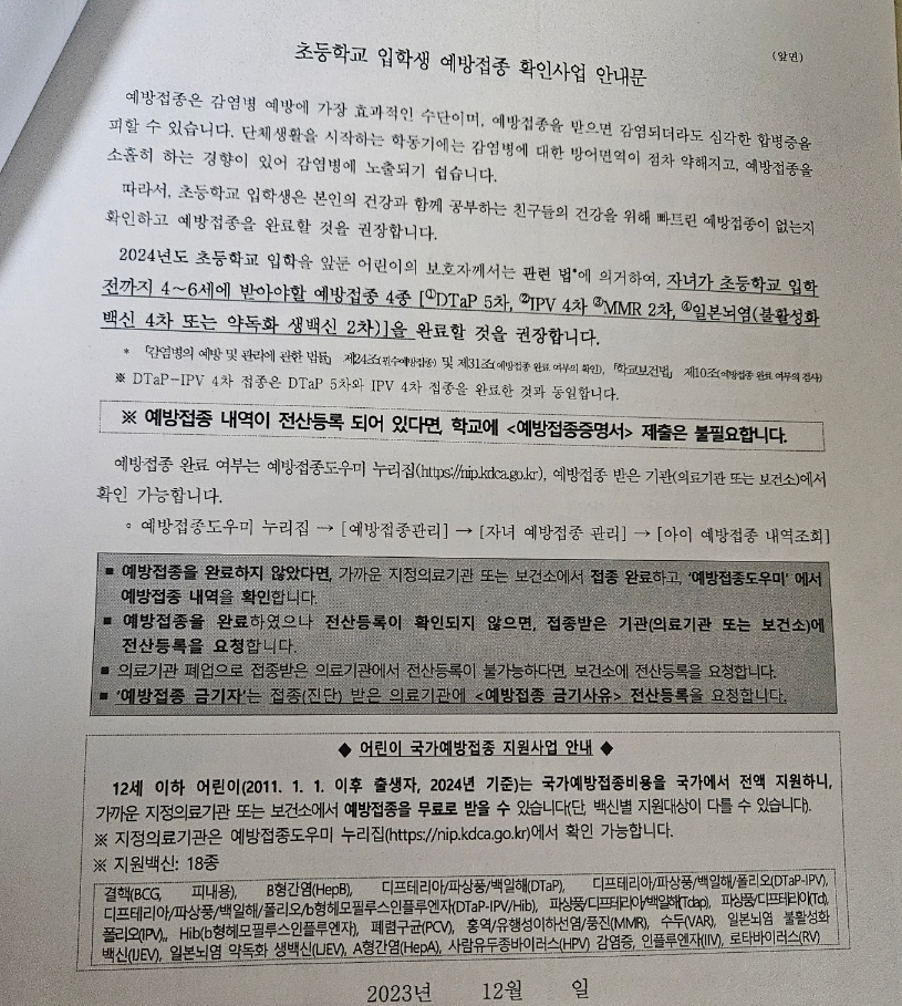 그리고 초등학교 입학 전 필수 예방접종은 꼭 하고 입학 해야해요. 예방접종 확인은 인터넷 예방접종도우미 사이트에서 확인 가능해요. 관련 내역이 모두 확인된다면 예방접종증명서를 따로 제출하지 않아도 되고 예방접종을 아직 하지 않았다면 의료기관 방문 후 접종 후 전산등록 요청하면 돼요. 초등학교 필수 예방접종 4종은 IPV 4차, MMR 2차, 일본뇌염 4차, DTaP 5차이니 참고하세요.