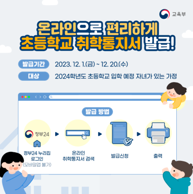 취학통지서는 미취학 어린이가 교육을 받기 위해 학교에 들어가는 것을 허락하거나 알리는 문서예요. 거주지역 행정복지센터에서 모든 초등학교 입학 예정 아동의 보호자에게 우편( 등기), 인편으로 취학통지를 실시해요. 이와 함께 정부24 누리집을 통해 온라인 취학통지서 발급서비스도 같은 기간에 제공해요.