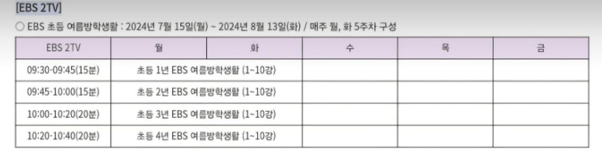 1. EBS 2TV (모든 통신사별 채널 95번) - 1, 2학년 : 월, 화/ 3, 4학년 : 월~ 금