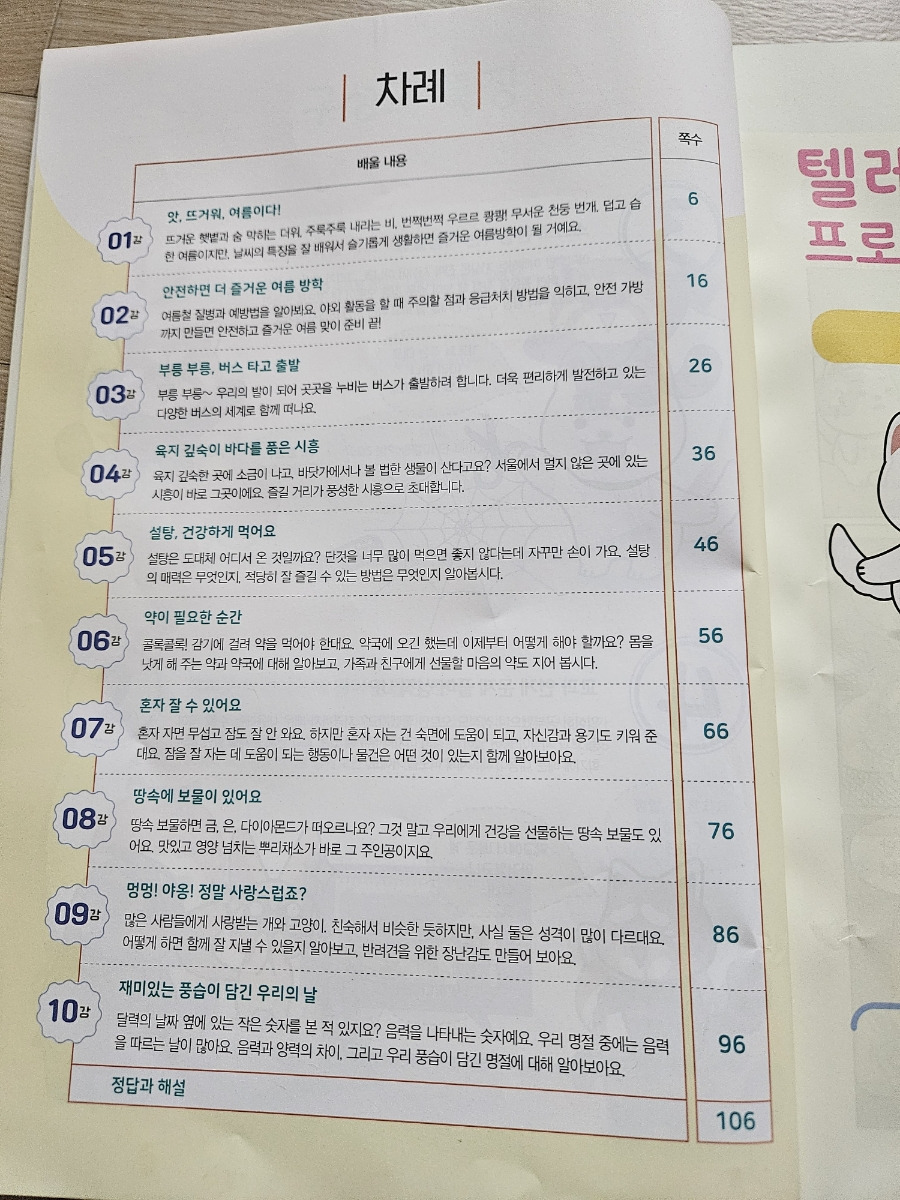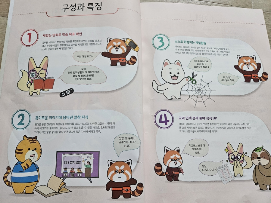 첫 장을 넘기며 구성과 특징이 나오고, 어떤 내용을 배우는지 10강의 차례가 쭉 나와요. 학습목표를 확인하고 교재내용을 가볍게 읽어 본 후 TV나 인터넷으로 영상강의를 들은 뒤 교과 연계문제를 푸는 활동이 나와요.