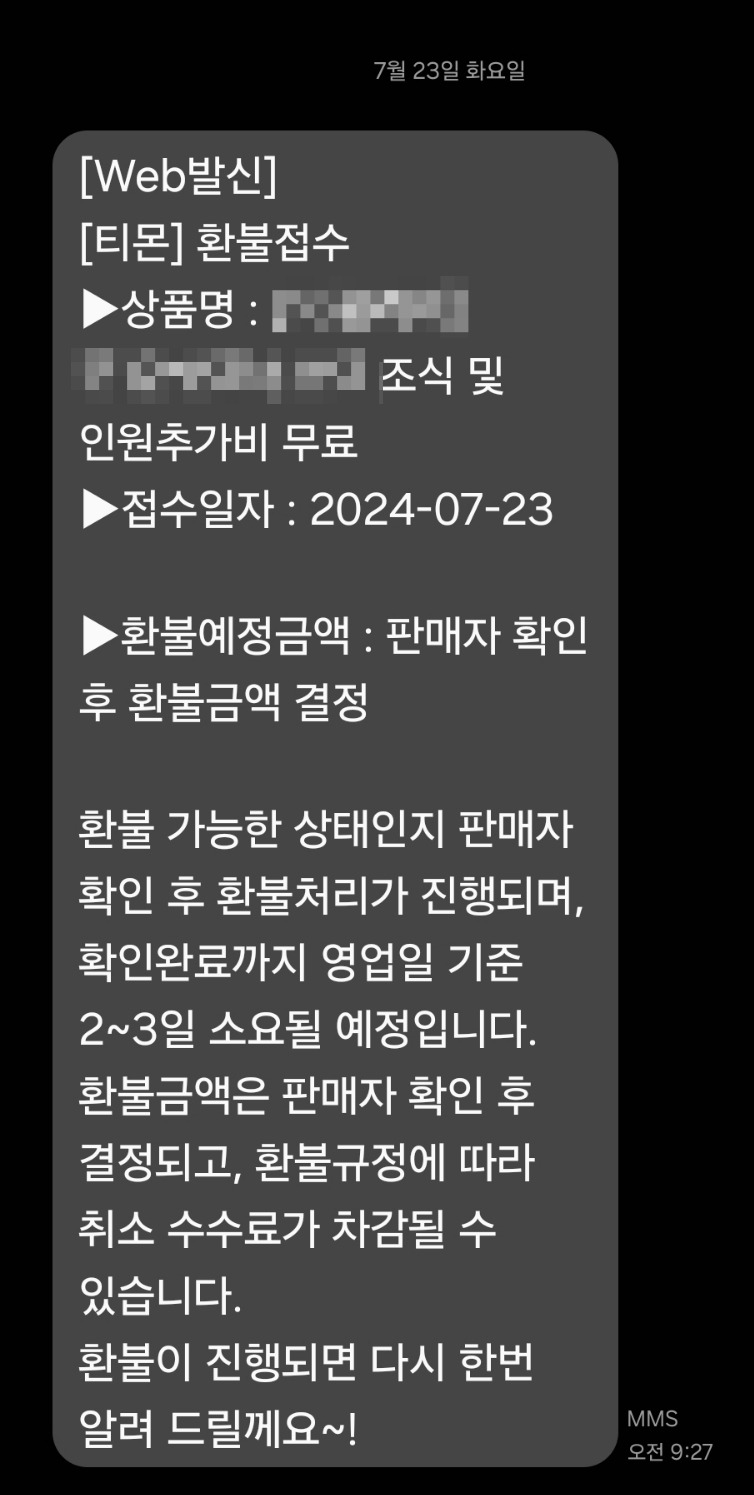 위메프 사태 이후 티몬에서도 일부 판매자의 판매 중단 등으로 당사 상품 거래에까지 영향을 주고 있어요. 대금을 받지 못한 판매자(업체)에서 지난주부터 소비자들에게 취소 안내를 시작했어요. 저희도 숙박권을 티몬을 통해 구입한 것이 있었는데 판매자가 22일 아래와 같은 문자를 보내서 환불을 진행했어요. 고객센터와 연락이 닿지 않아서 다음날인 23일 아침 9시에 전화를 했고, 25분을 기다리고 통화연결이 되었어요. 전날까지만 해도 카카오페이 결제 건은 바로 취소가 되었다고 하는데 23일부터는 판매자 확인 후 환불금액 결정 된다고 안내하더라고요. 이후 판매자(업체)가 미승인티켓인지 확인 후 처리가 되는지라 한참시간이 지났어요. 업체에도 전화해서 빨리 처리해 달라고 이야기했는데 순차적으로 진행한다고 기다려달라고 답변하며 당일에는 다 승인하겠다고 안내하더라고요. 오후 되어서 업체에서 승인을 했고, 그래서 취소가 바로 되는 거라 생각했는데, 큰 오산이었어요. 또다시 티몬에서 결제취소실패로 환불계좌를 등록하라고 문자가 오더라고요.