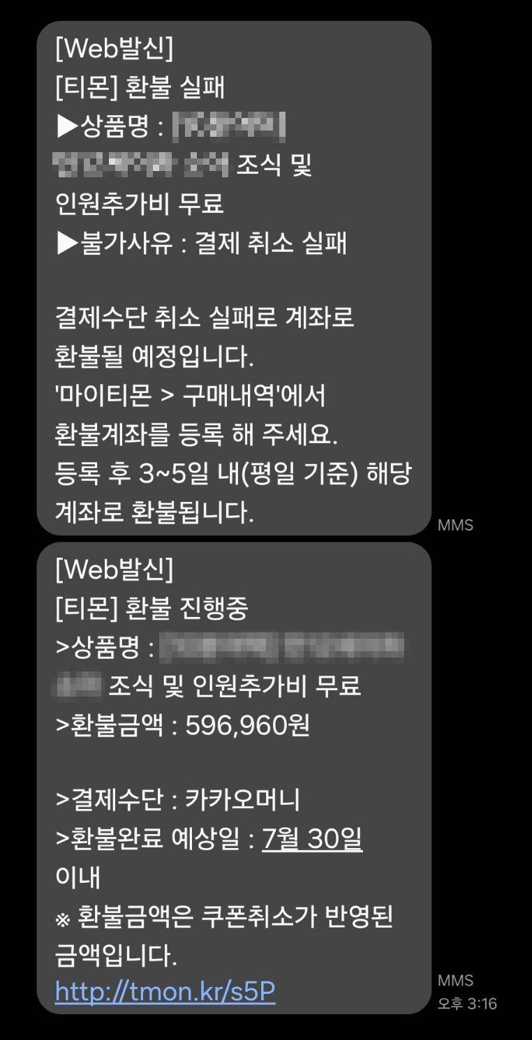 23일 오전 티몬 환불접수 -> 판매자 확인 후 환불금액 결정된다고 안내받음 -> 판매자(업체)에 통화(순차적으로 진행 중이고 오늘 중으로 다 처리할 거라고 답변받음) -> 23일 오후 판매자(업체) 미사용 티켓 확인 후 승인 -> 티몬에서 결제취소 실패로 환불계좌 등록하라고 안내 -> 환불계좌 등록 -> 현재 계좌 환불대기 상태