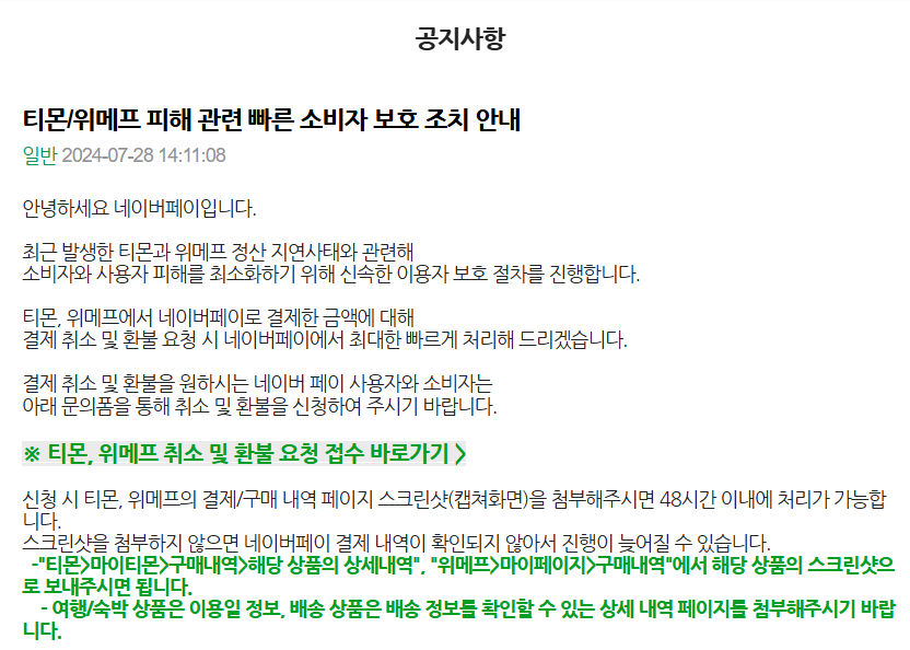 네이버페이는 간편결제 기업 중 유일하게 ‘티몬·위메프 사태’ 관련 소비자 환불 신청 건에 대한 처리 시간을 명시했어요. 네이버 페이는 티몬, 위메프의 결제·구매 내역 페이지 캡처 화면을 첨부하면 48시간 이내 처리할 예정이라고 해요. 네이버 페이 공식 홈페이지 좌측 하단 메뉴에 공지사항이 있어요. 공지사항에서 티몬, 위메프 취소 및 환불 요청 접수 바로가기를 클릭하면 환불진행 할 수 있어요.